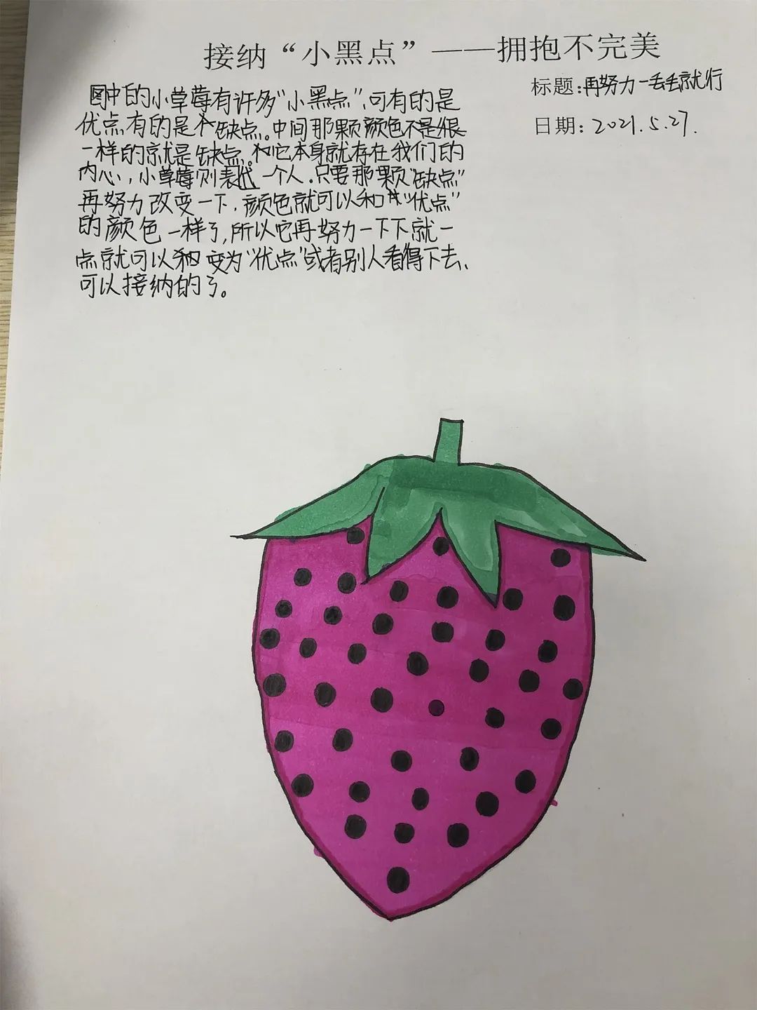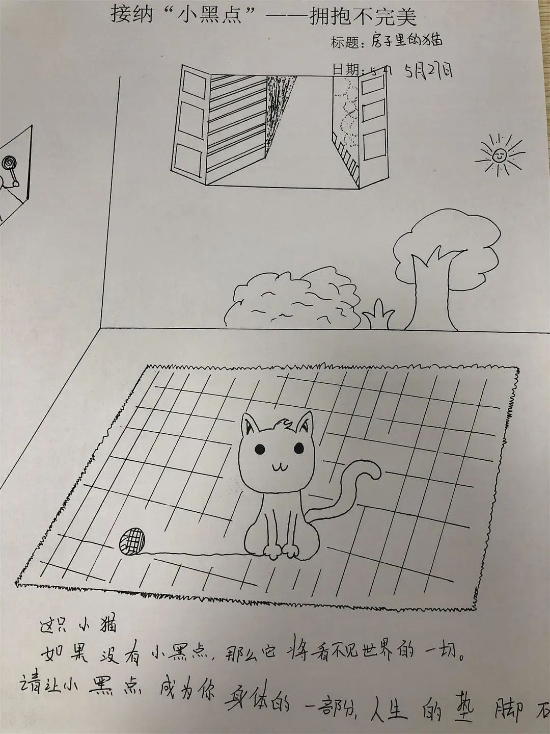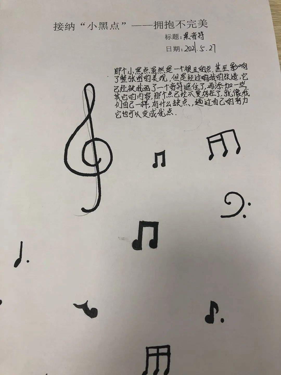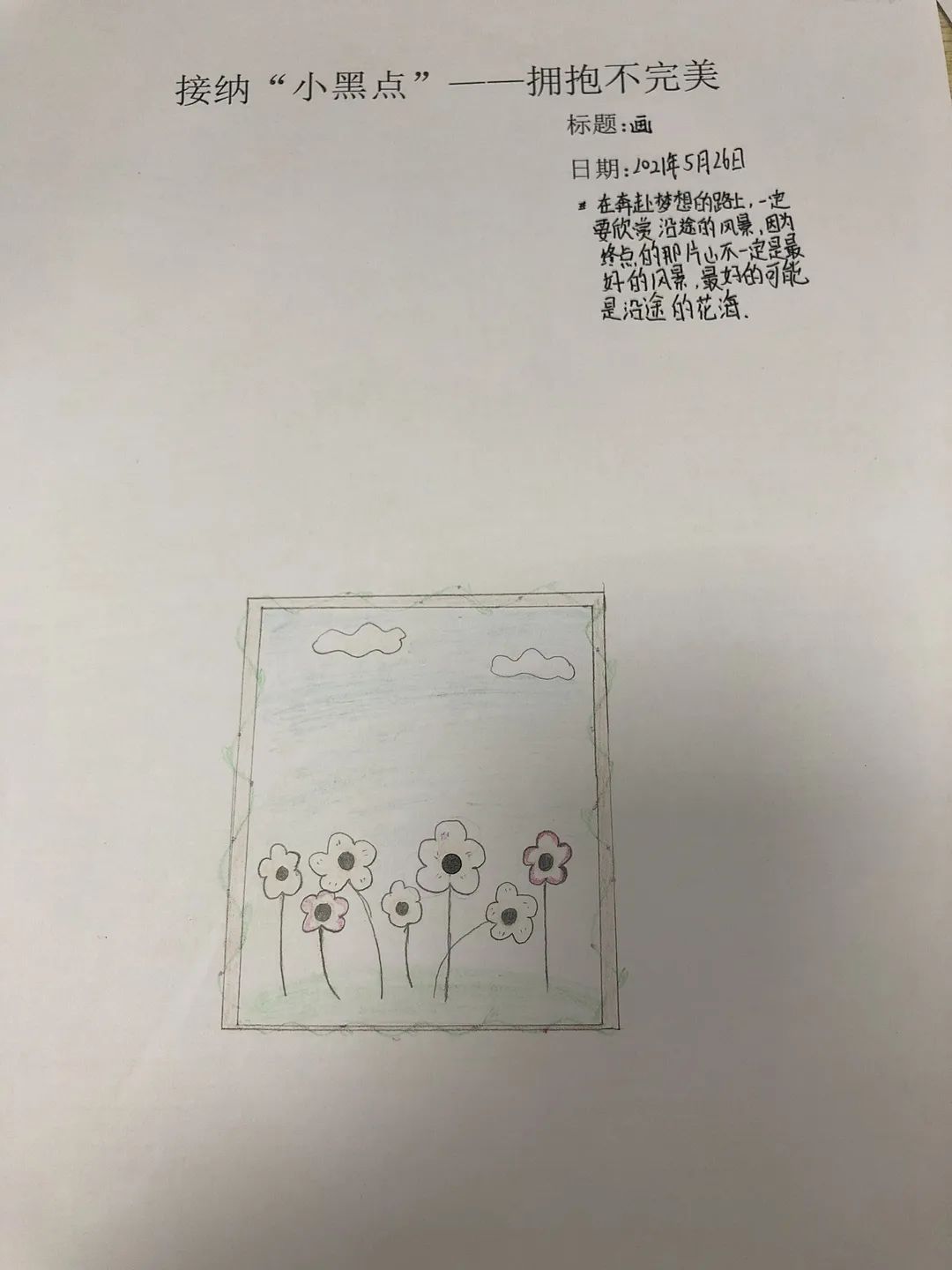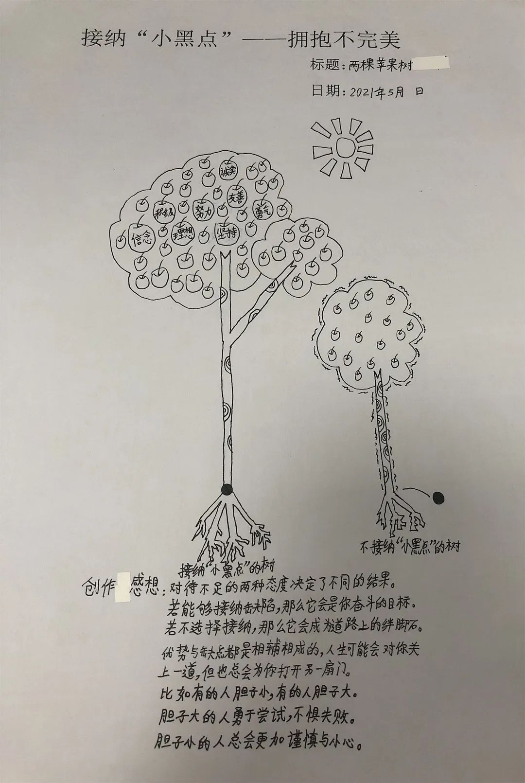 對于我們來說,畫中的小黑點就像我們人生中遇到的苦難,挫折和失敗,它們是我們人生中無法避免的“小黑點”。雖然它們讓我們的生活畫卷看起來不完美,但只要我們開動腦筋,積極解決,一樣能夠在自己的人生畫紙上創(chuàng)作出獨一無二的作品。