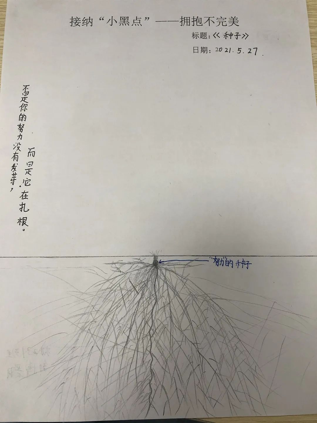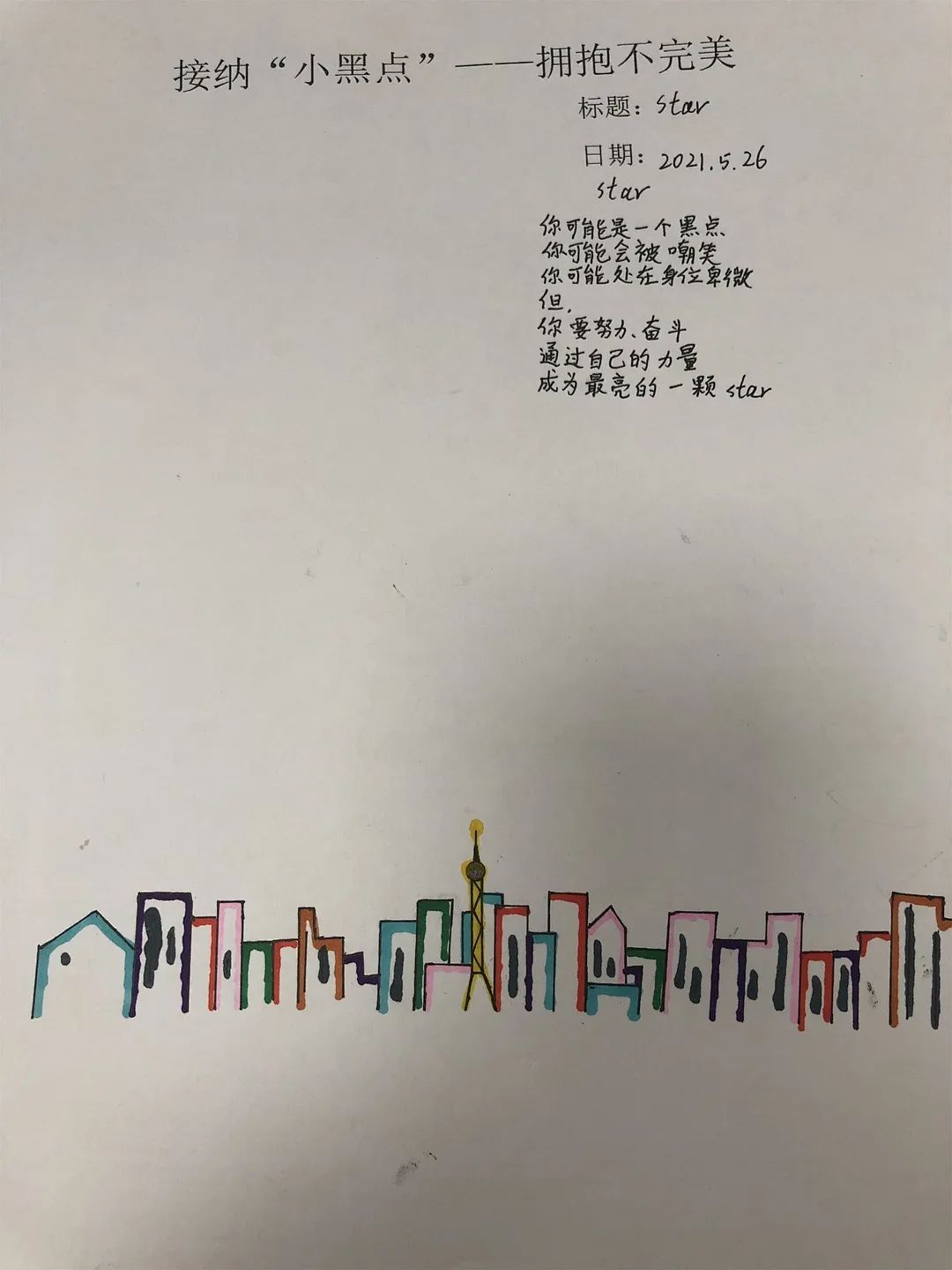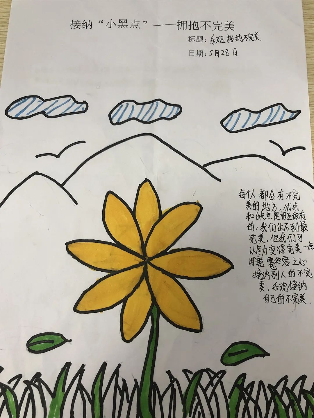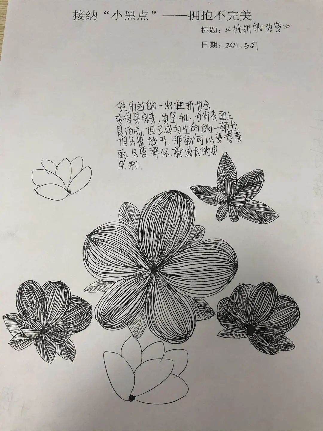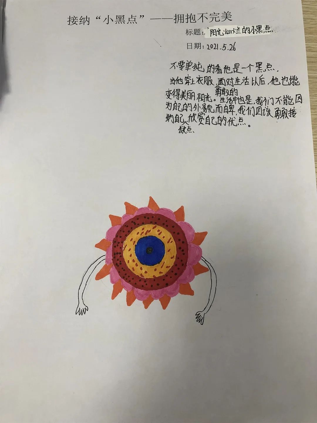 對于我們來說,畫中的小黑點就像我們人生中遇到的苦難,挫折和失敗,它們是我們人生中無法避免的“小黑點”。雖然它們讓我們的生活畫卷看起來不完美,但只要我們開動腦筋,積極解決,一樣能夠在自己的人生畫紙上創(chuàng)作出獨一無二的作品。
