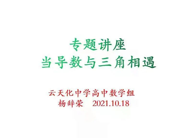 10月18日下午,云天化中學高中數(shù)學組在中學錄播室組織了一場別開生面的教學教研。高中數(shù)學組楊辭榮老師以“當導數(shù)與三角函數(shù)相遇”為題導入,給高中數(shù)學組帶了了一堂生動的專題講座。