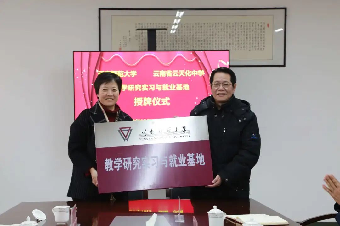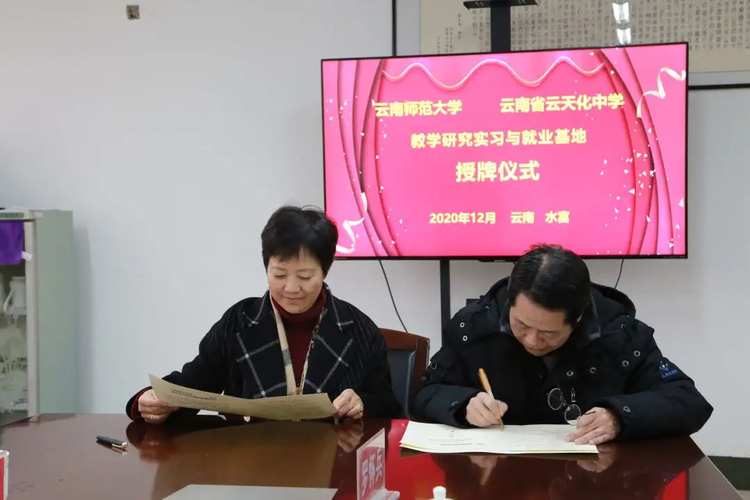 隨后雙方代表簽訂成立實(shí)習(xí)與就業(yè)基地的協(xié)議。李紅處長為云天化中學(xué)授予“云南師范大學(xué)教學(xué)研究實(shí)習(xí)與就業(yè)基地”牌匾。云天化中學(xué)校黃林校長表示,加大與云南師范大學(xué)的教學(xué)教研合作,為云師大畢業(yè)生實(shí)習(xí)就業(yè)提供出彩的平臺,創(chuàng)造良好的就業(yè)環(huán)境,實(shí)現(xiàn)人才資源共享。
