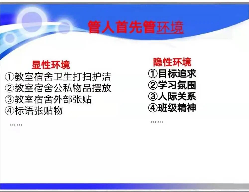 屈華老師說,此處所言的環(huán)境,是小環(huán)境,主要指教室、宿舍以及校園,不僅指我們的衛(wèi)生打掃與護(hù)潔、公私物品擺放、標(biāo)語張貼物等,也包含班集體學(xué)習(xí)氛圍、人際交往、精神面貌、目標(biāo)追求等?!肮苋耸紫裙墉h(huán)境”的好處是易操作、很直接、見效快,最主要的就是管好環(huán)境很有價(jià)值!