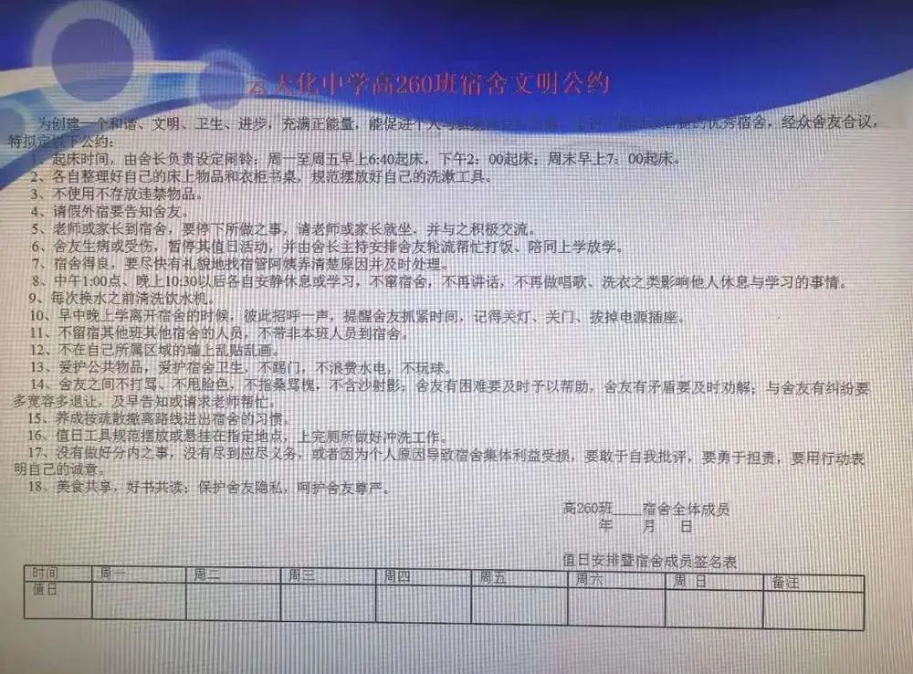 比如,屈老師班的學(xué)生宿舍,有統(tǒng)一的文明公約,這是他在班上所有學(xué)生自己擬定公約基礎(chǔ)上進(jìn)行整合而形成的,上面有關(guān)于作息時(shí)間的、關(guān)門開門的、怎樣避免發(fā)生糾紛、如何接待來訪老師等等的指導(dǎo),也有關(guān)于衛(wèi)生打掃責(zé)任等等;如果衛(wèi)生做不好,一般沒有懲罰,但宿舍成員要弄清楚原因總結(jié)出問題,若有必要老師還會(huì)組織相關(guān)經(jīng)驗(yàn)交流小會(huì),讓他們向優(yōu)秀宿舍學(xué)習(xí)。