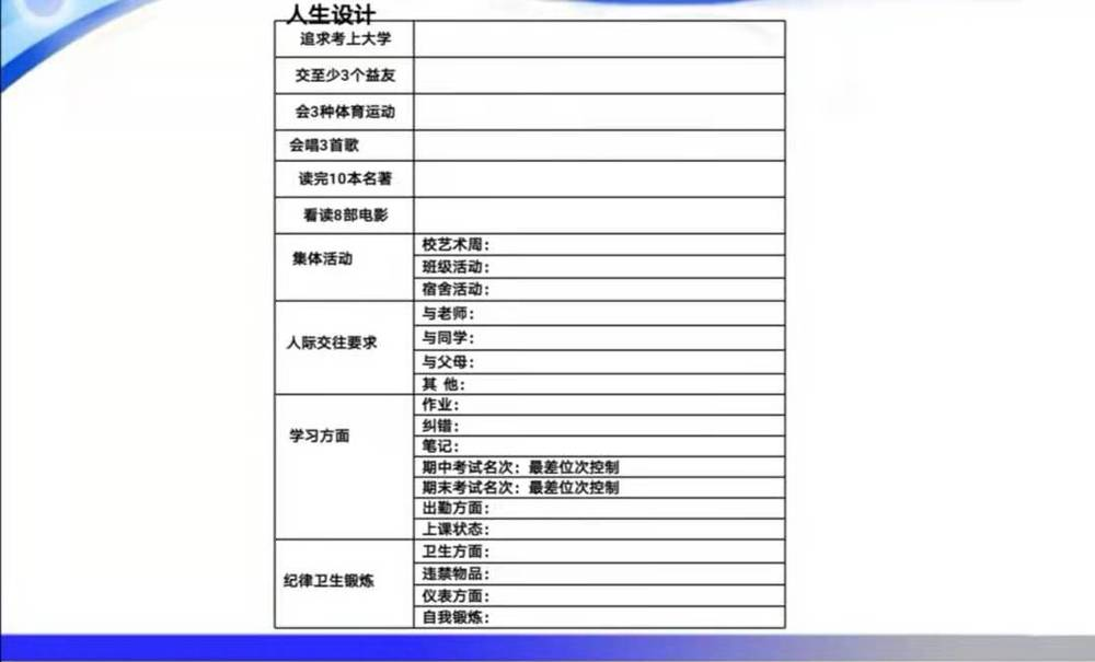 屈老師從高一開始,就設(shè)計(jì)表格“從今天起,為未來美好生活?yuàn)^斗——高260班學(xué)生高一年級(jí)自我人生設(shè)計(jì)”,里面包含“追求大學(xué)”“交3位益友”“會(huì)3種體育運(yùn)動(dòng)”“會(huì)唱3首歌”“讀完10本名著”以及在紀(jì)律、衛(wèi)生、考勤、集體活動(dòng)等方面的要求,每一學(xué)期讓學(xué)生重讀一次,檢查自己完成情況,新發(fā)表格,在原來基礎(chǔ)上調(diào)整補(bǔ)充。他希望以此從過程著手,督導(dǎo)學(xué)生走向理想的目標(biāo)。