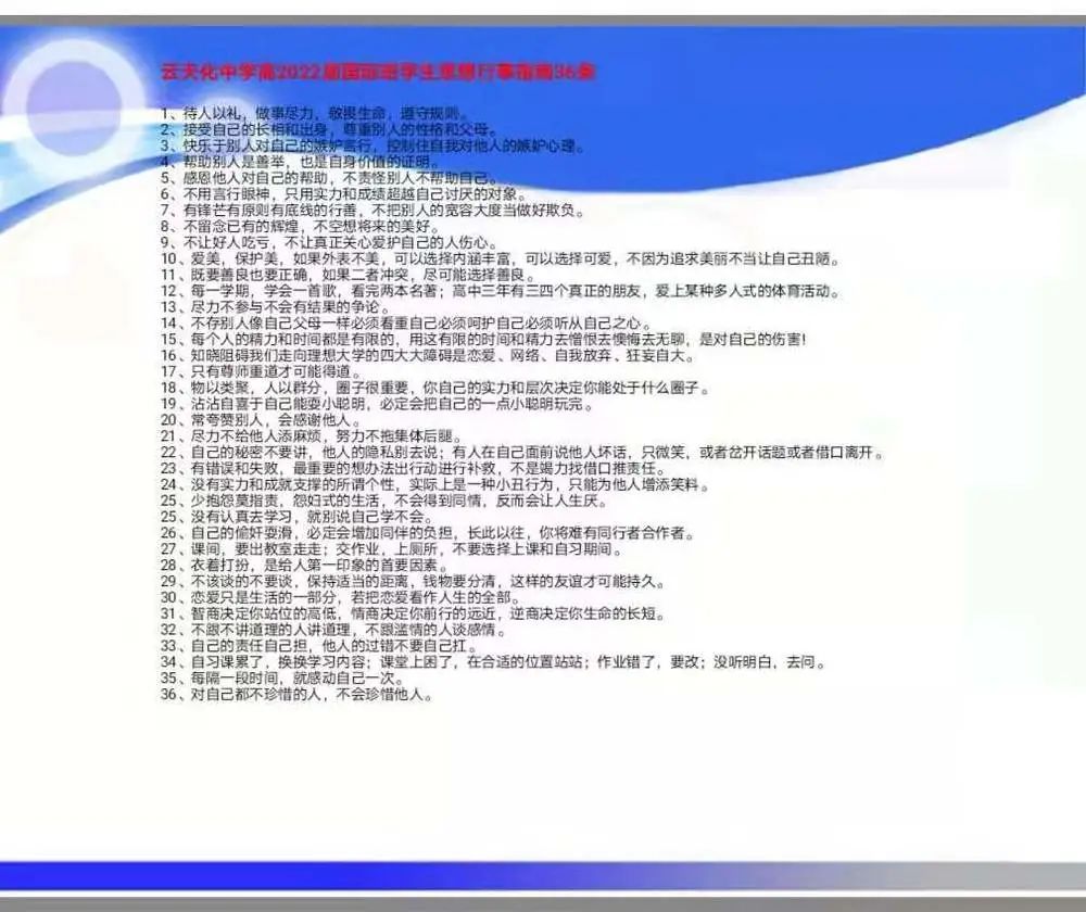 比如,他就“作為國際班,我們應(yīng)該為人處事情,避免不必要的麻煩,更好前行”組織全班學(xué)生進(jìn)行討論,最終形成了“云天化中學(xué)高2022屆國際班學(xué)生思想行事指南36條”,并將之印出來,給學(xué)生通讀,不時(shí)讀,也發(fā)到家長群,讓家長了解。另外,他又不定時(shí)地引導(dǎo)學(xué)生以填表格輪流讀表格的方式融洽同學(xué)關(guān)系,比如“我就這樣不斷成長”的表格,里面含有本月“最大的收獲”“最高興的事” “最感動(dòng)的事” “該感謝的人” “對(duì)不起的人” “不希望再有的事”等項(xiàng)目,讓學(xué)生不記名地在表上一吐心曲,然后輪流閱讀并寫上有關(guān)應(yīng)答或安慰之語;類似的,還有“同學(xué),我能幫你什么忙”的表格填寫閱讀等。這應(yīng)該就是屈老師班上同學(xué)關(guān)系、師生關(guān)系比較融洽的一個(gè)重要原因吧!