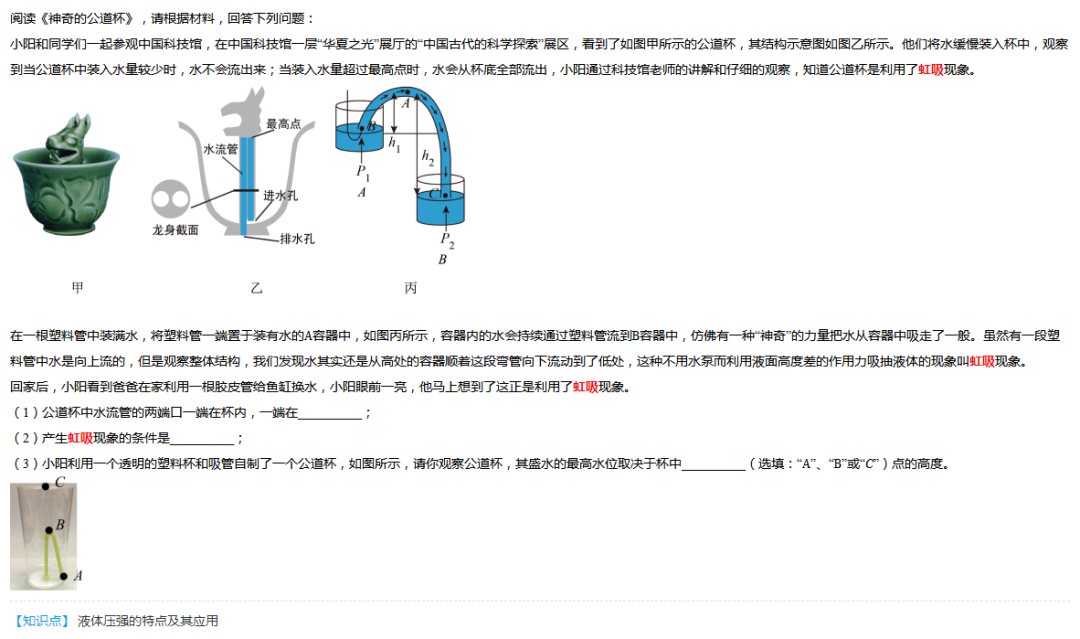 虹吸原理與普通噴泉可用帕斯克定律解釋:加在密閉液體上的壓強(qiáng)能夠大小不變地被液體向各個(gè)方向傳遞。