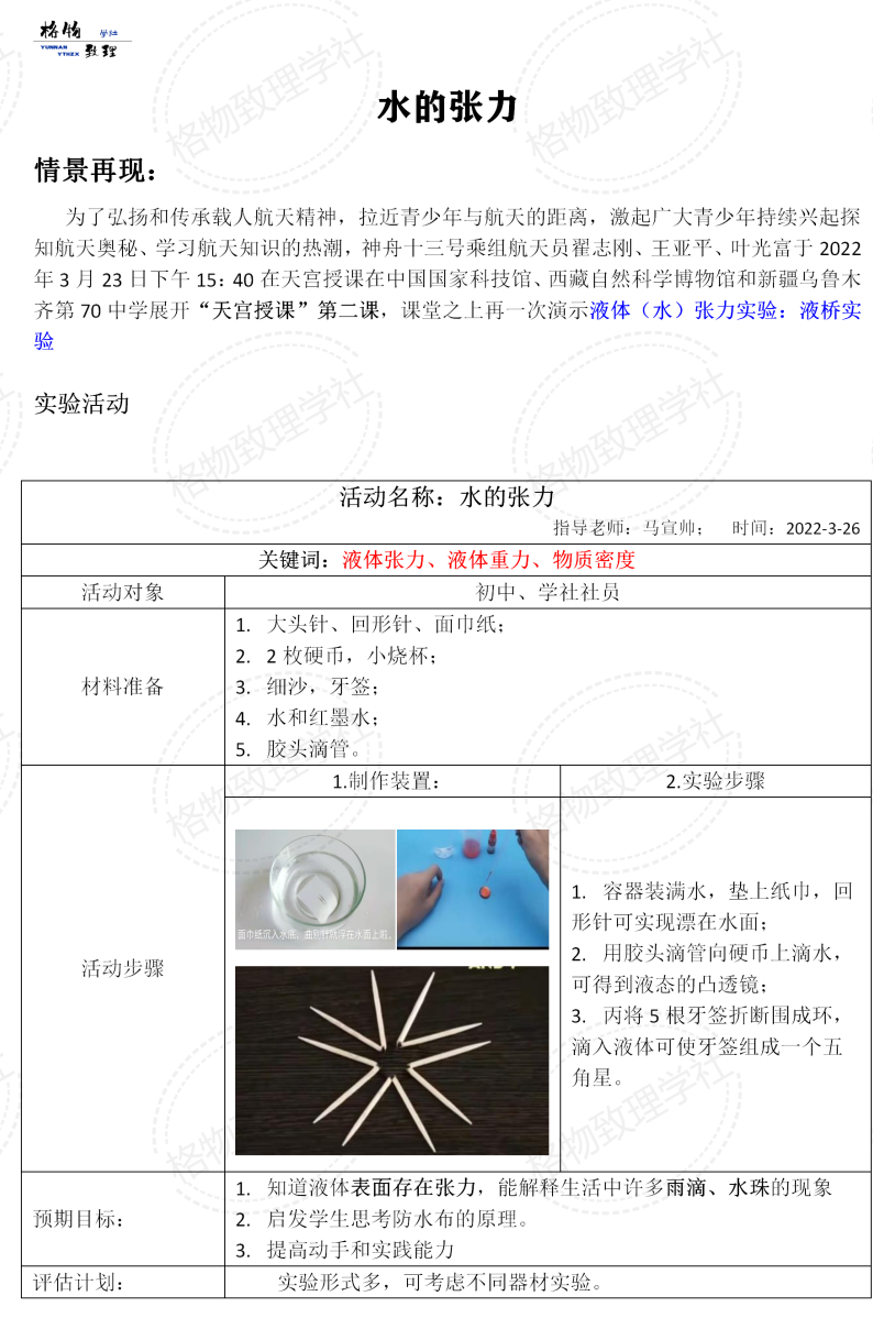 為了弘揚(yáng)和傳承載人航天精神,拉近青少年與航天的距離,激起廣大青少年持續(xù)興起探知航天奧秘、學(xué)習(xí)航天知識(shí)的熱潮,神舟十三號(hào)乘組航天員翟志剛、王亞平、葉光富于2022年3月23日下午15:40在天宮授課在中國(guó)國(guó)家科技館、西藏自然科學(xué)博物館和新疆烏魯木齊第70中學(xué)展開“天宮授課”第二課,課堂之上再一次演示液體(水)張力實(shí)驗(yàn):液橋?qū)嶒?yàn)
