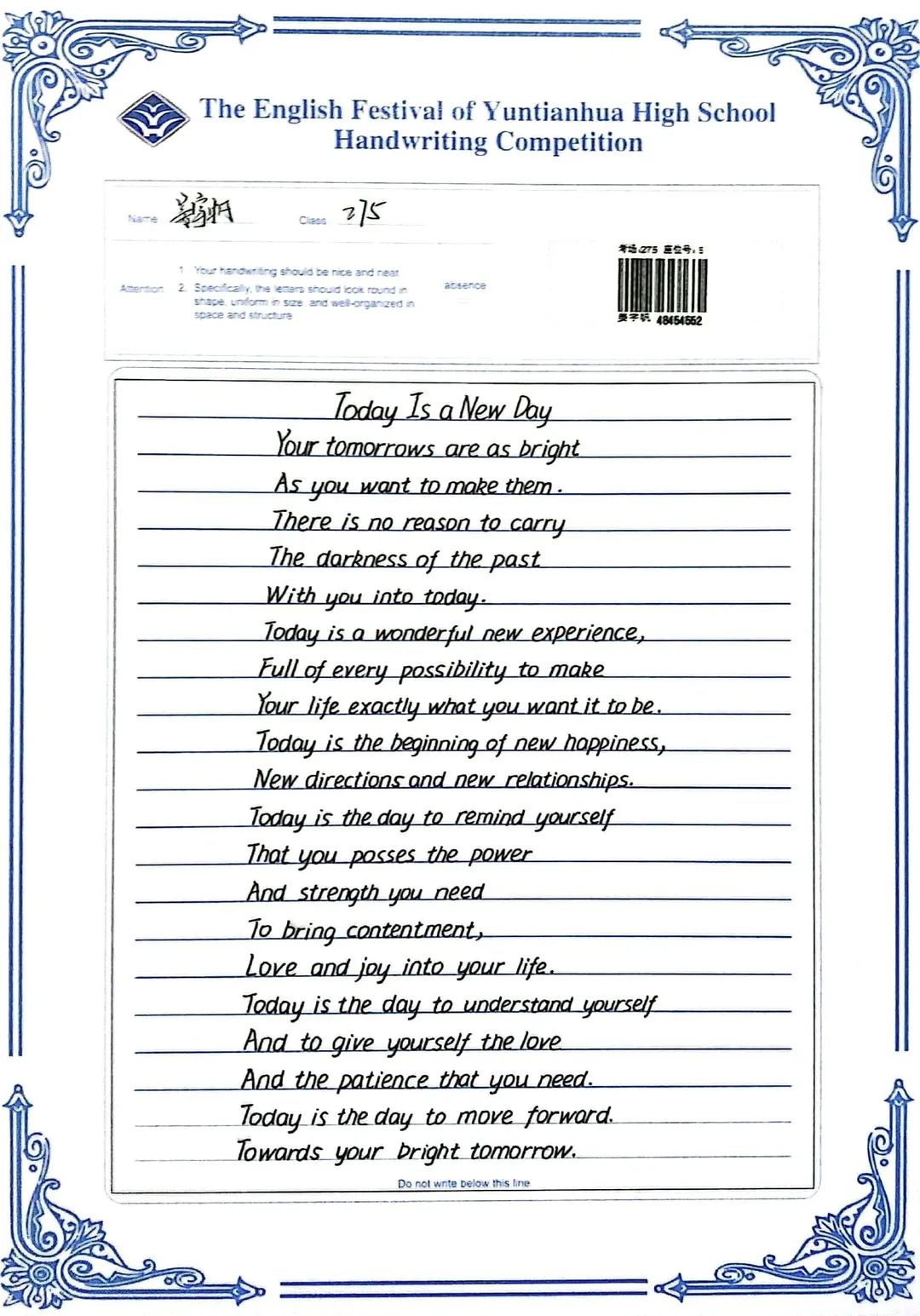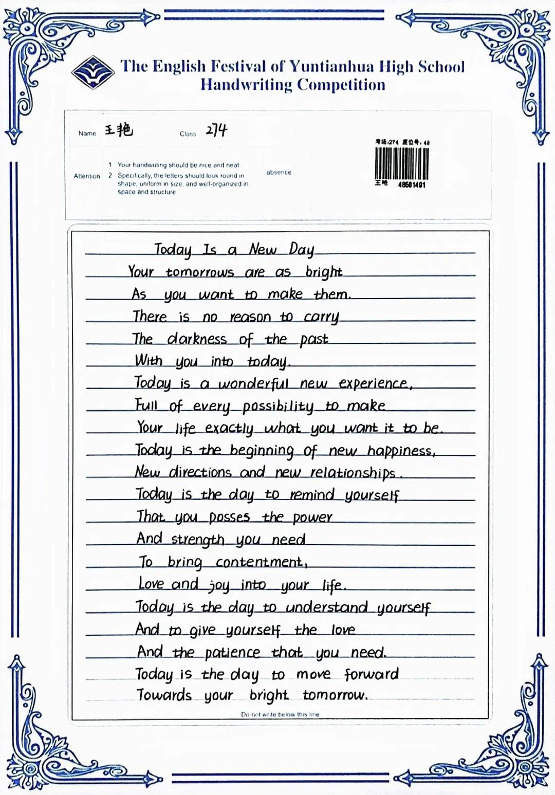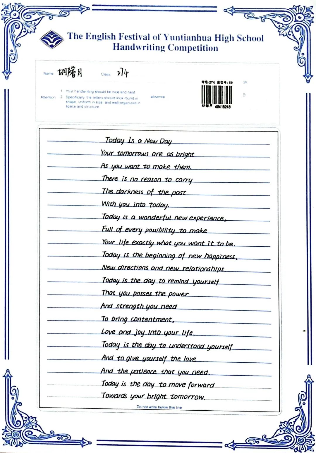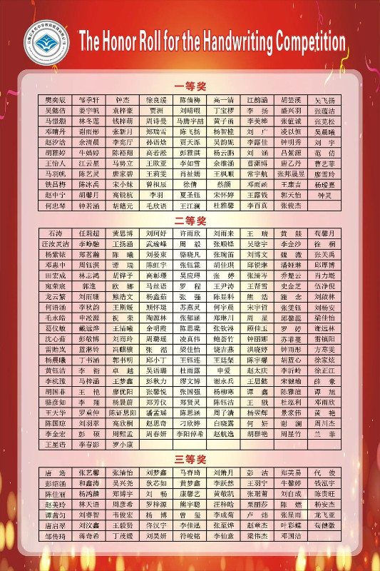 賽后,全體英語(yǔ)教師組成評(píng)委會(huì),立即掃描了學(xué)生的書寫作品,每份作品都經(jīng)過(guò)了雙評(píng)并且設(shè)有仲裁把關(guān)。經(jīng)過(guò)全體英語(yǔ)老師認(rèn)真細(xì)致、公平公正的評(píng)判,選出一等獎(jiǎng)98名,二等獎(jiǎng)183名,三等獎(jiǎng)62名,具體名單如下: