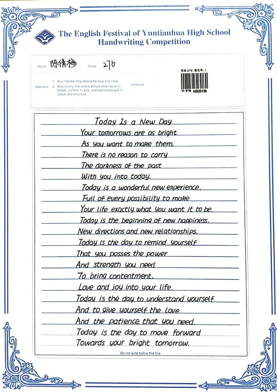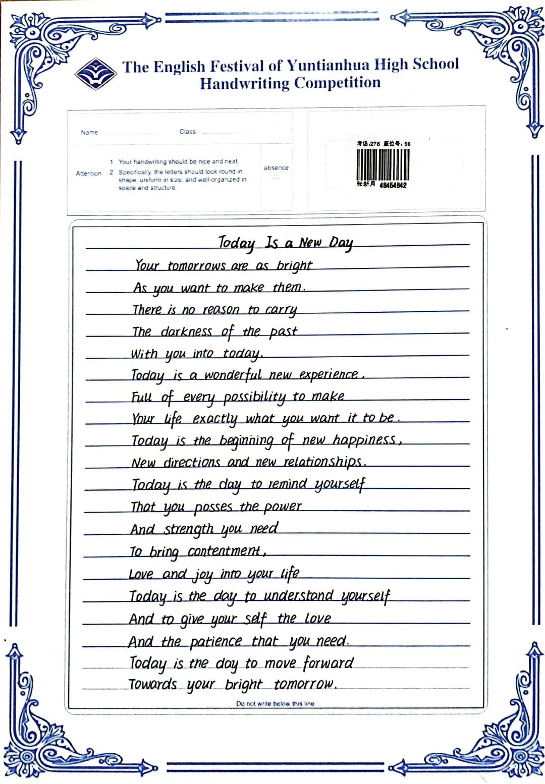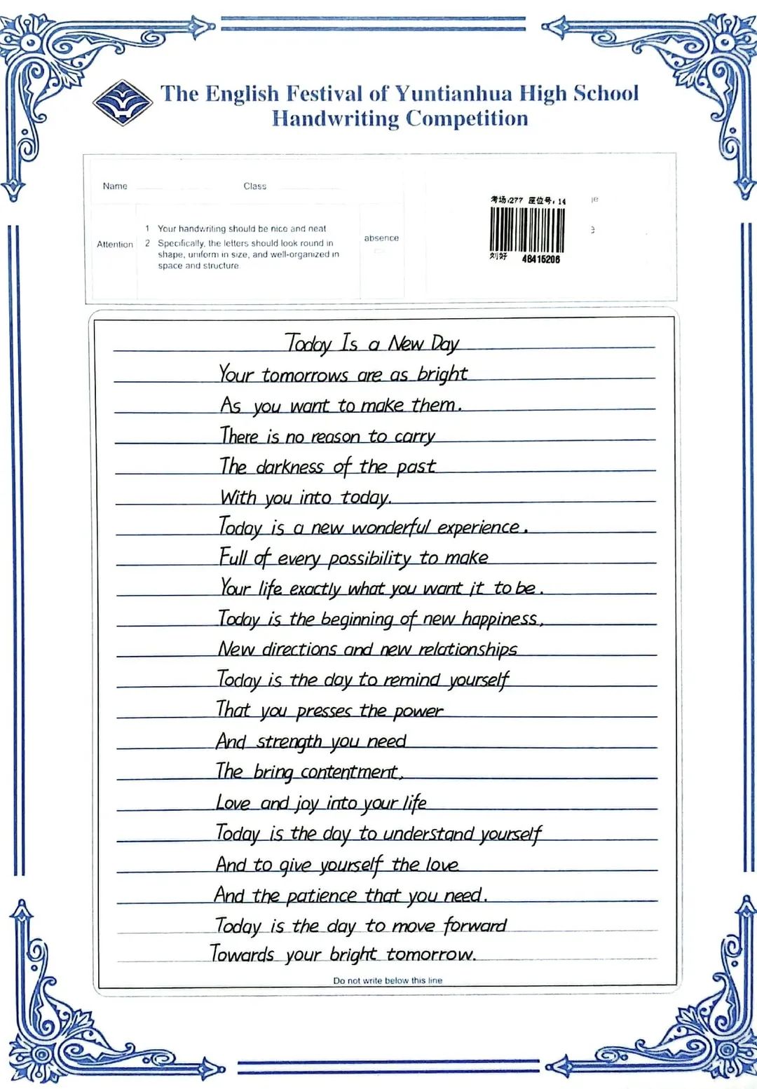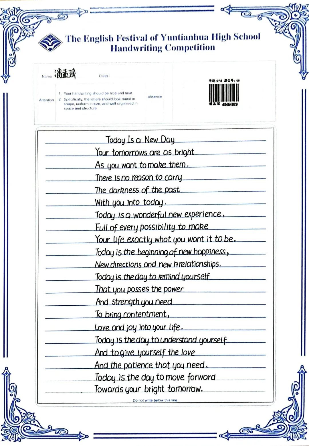 賽后,全體英語(yǔ)教師組成評(píng)委會(huì),立即掃描了學(xué)生的書寫作品,每份作品都經(jīng)過(guò)了雙評(píng)并且設(shè)有仲裁把關(guān)。經(jīng)過(guò)全體英語(yǔ)老師認(rèn)真細(xì)致、公平公正的評(píng)判,選出一等獎(jiǎng)98名,二等獎(jiǎng)183名,三等獎(jiǎng)62名,具體名單如下: