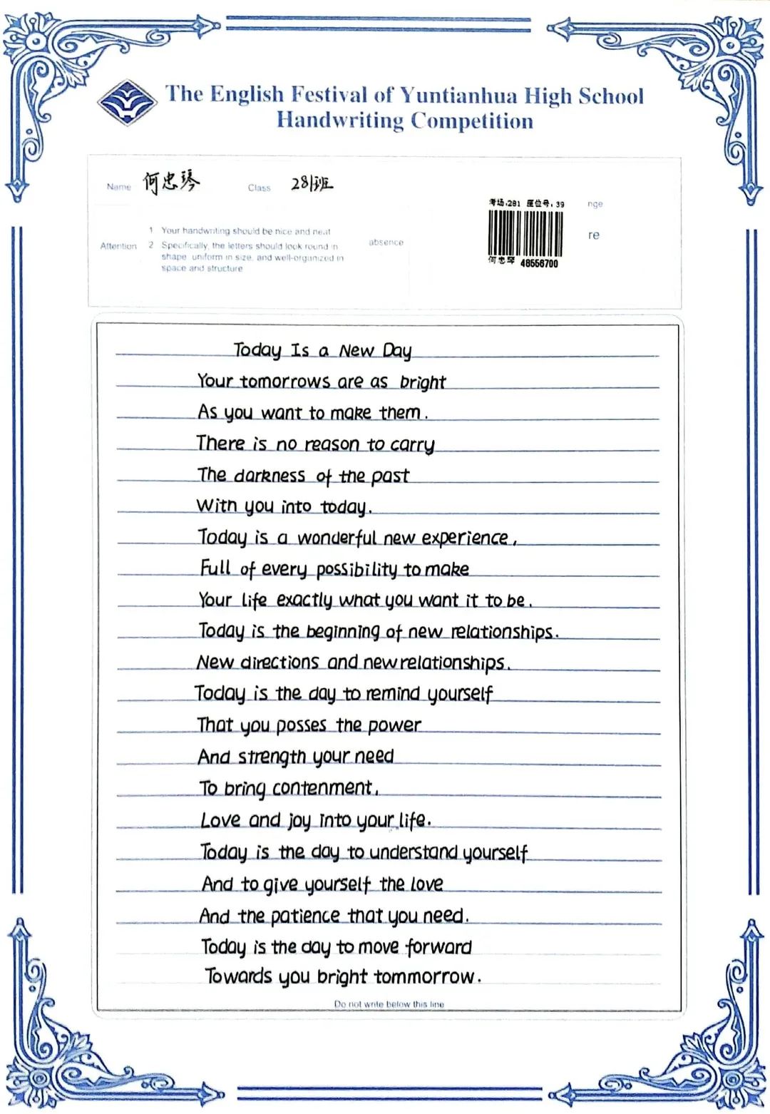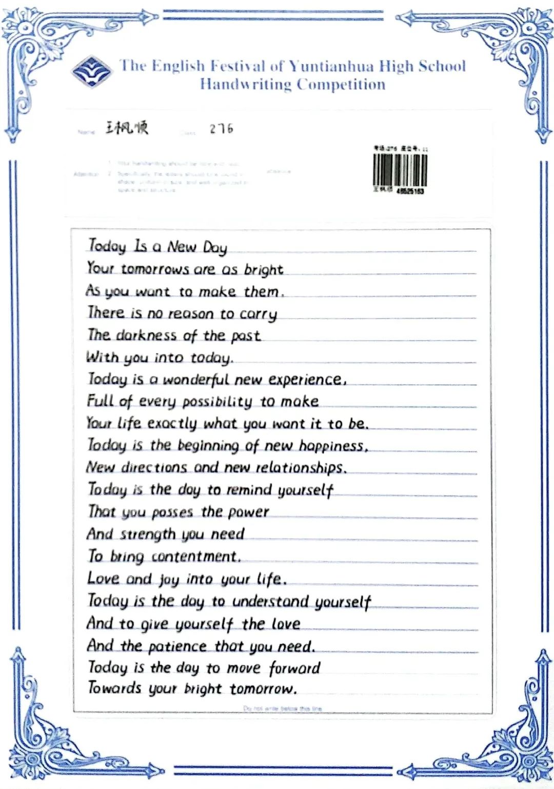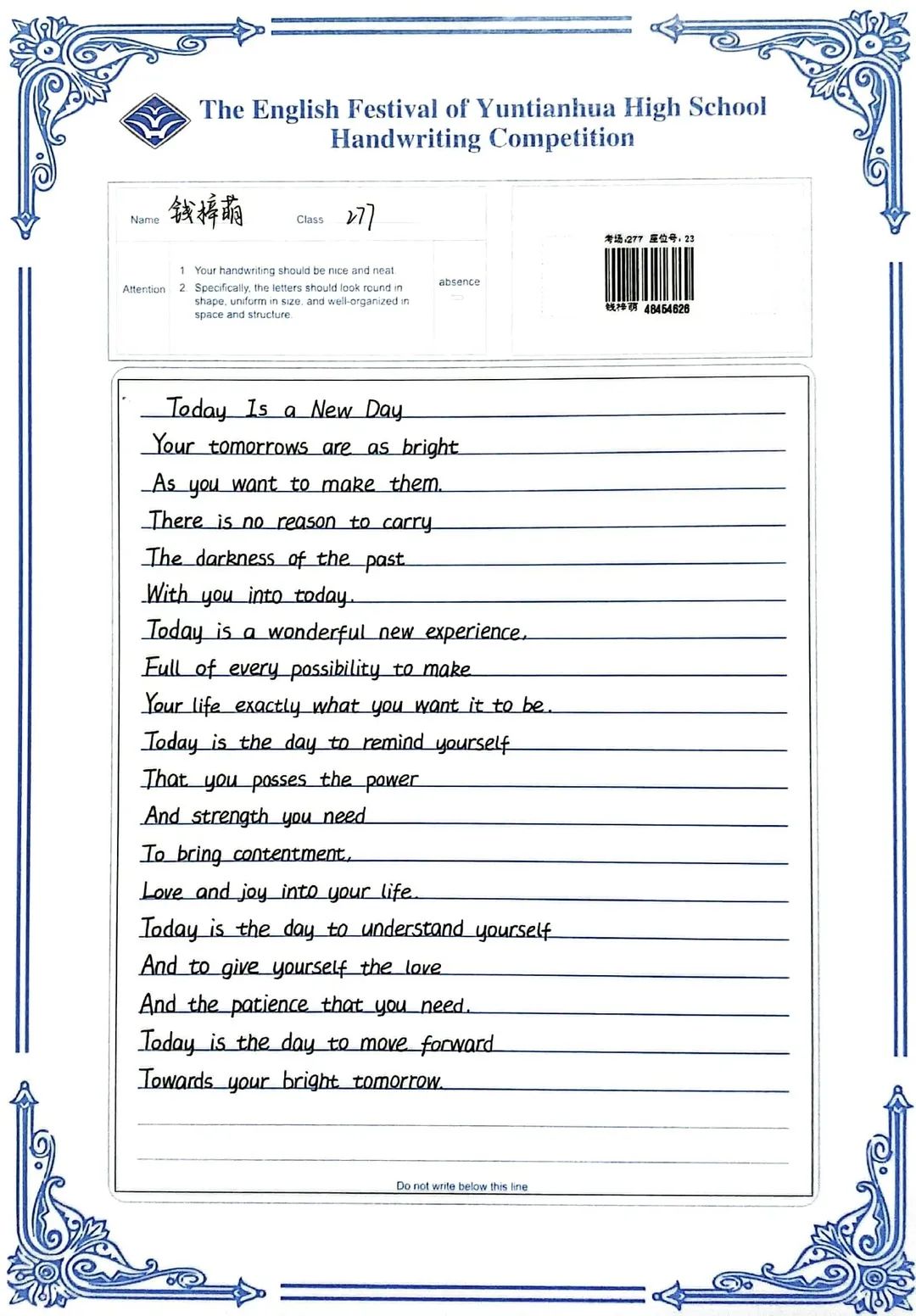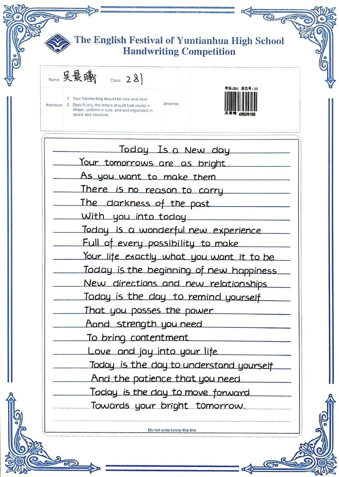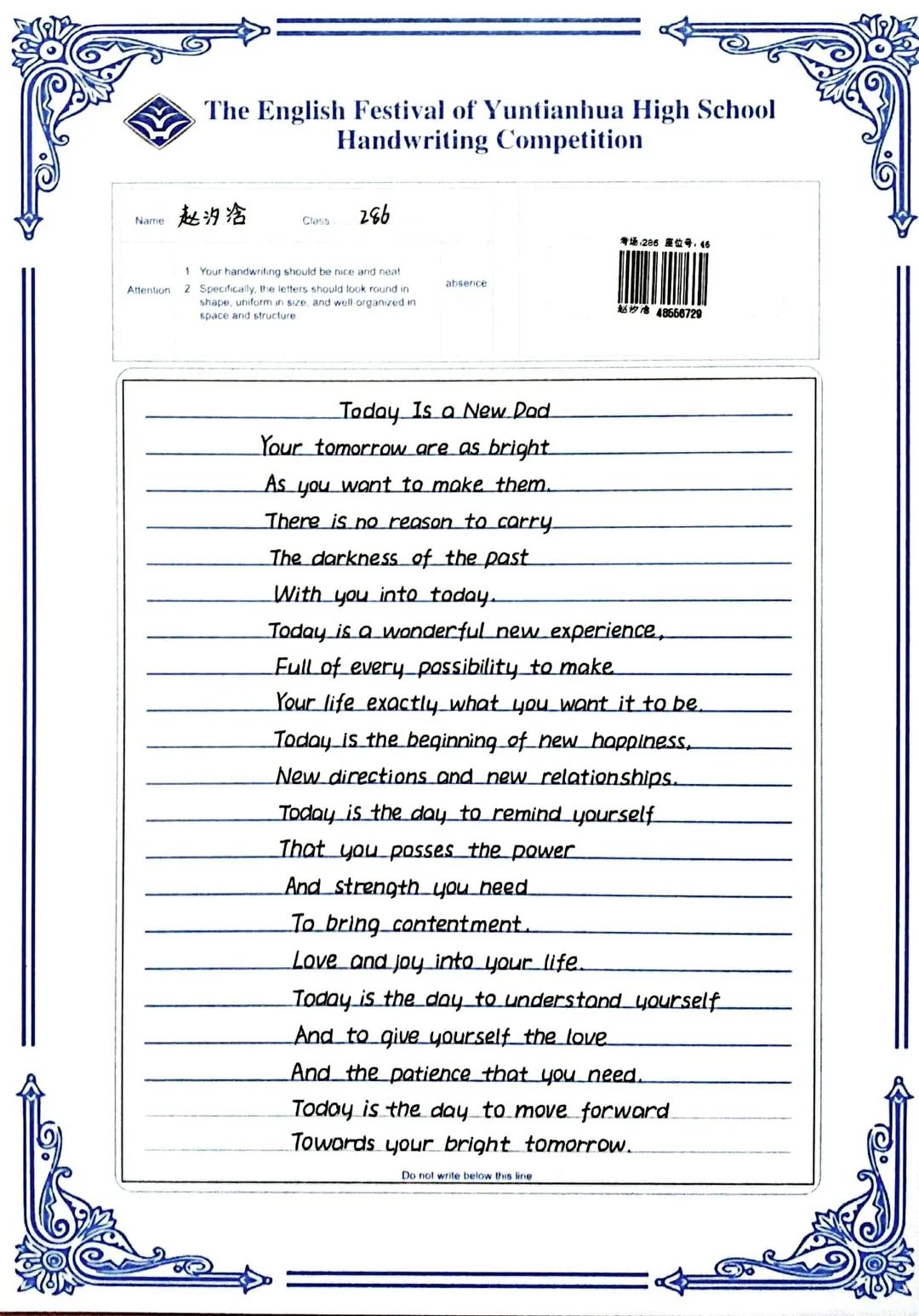 賽中,同學(xué)們都熱情響應(yīng),積極參與,展示了扎實(shí)的英語(yǔ)書寫功底,字跡流暢端正,卷面整潔漂亮,每一幅作品都是獨(dú)一無(wú)二的創(chuàng)作,讓我們一起來(lái)欣賞吧!