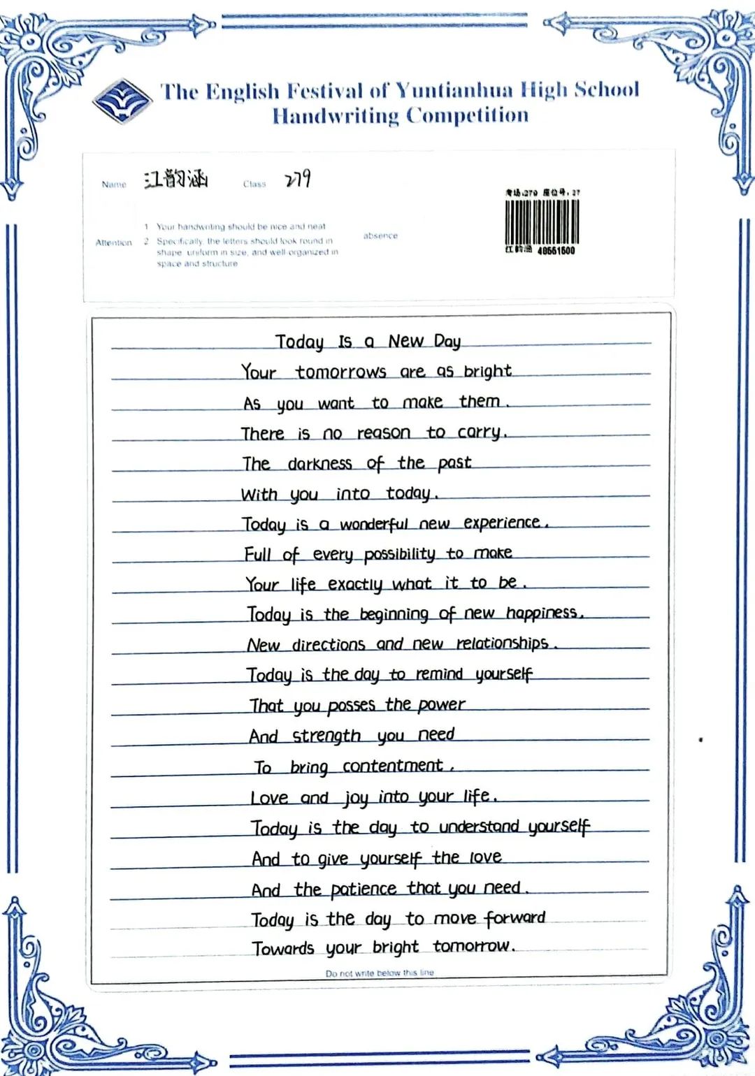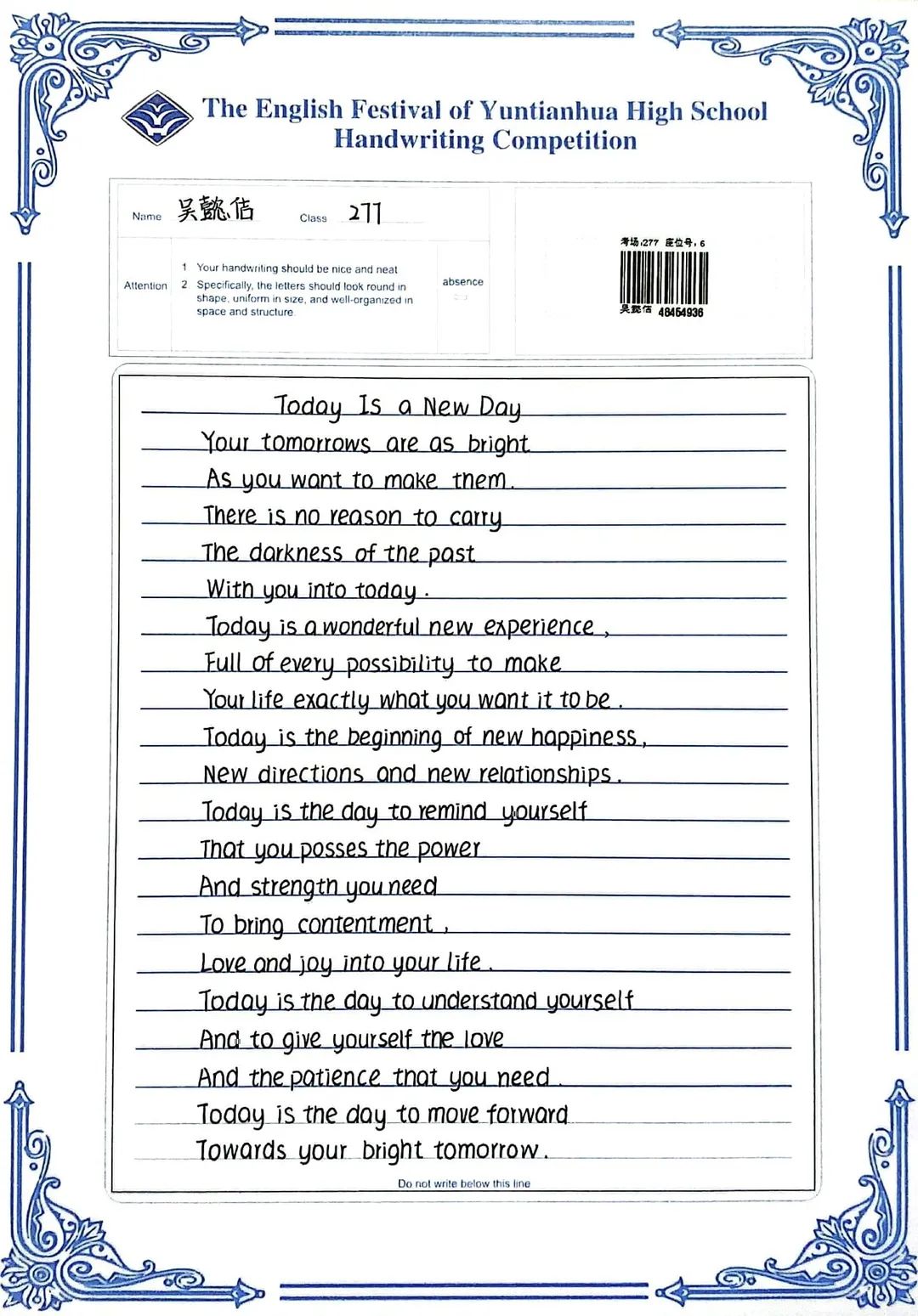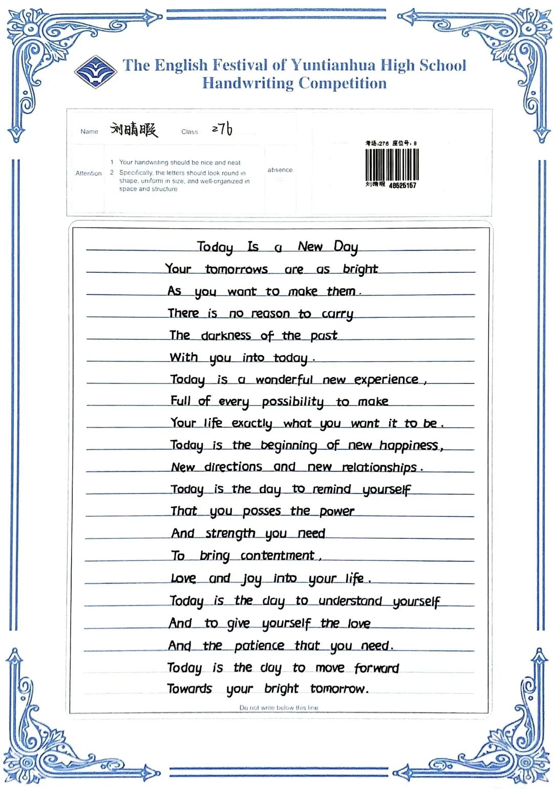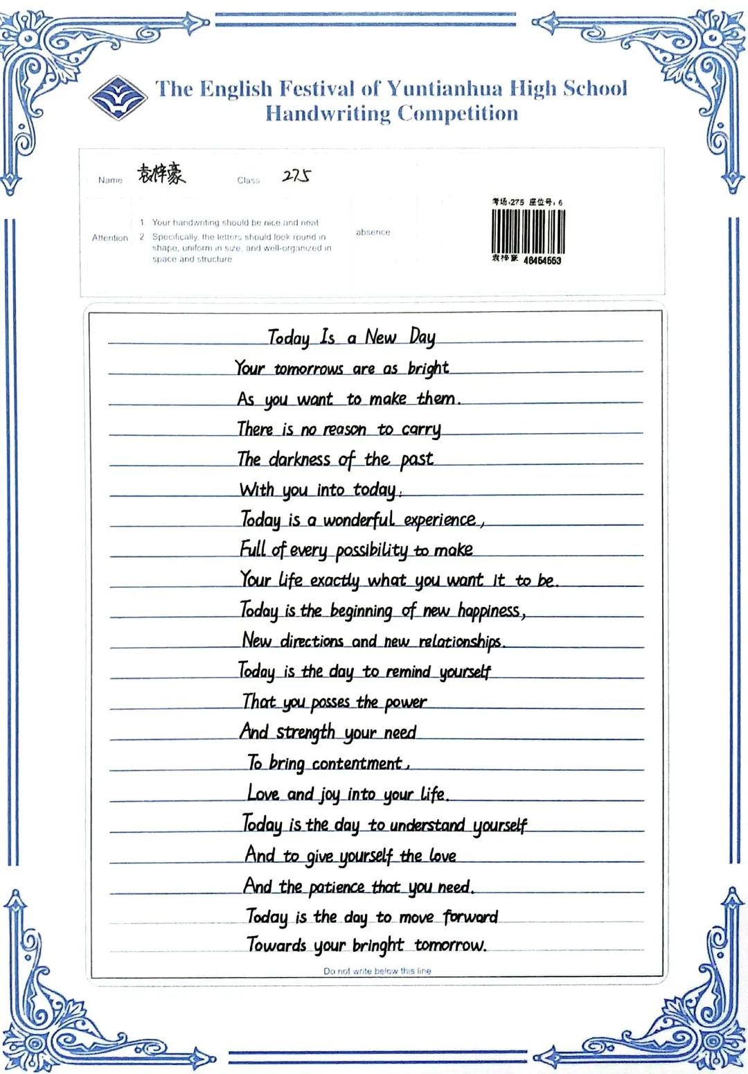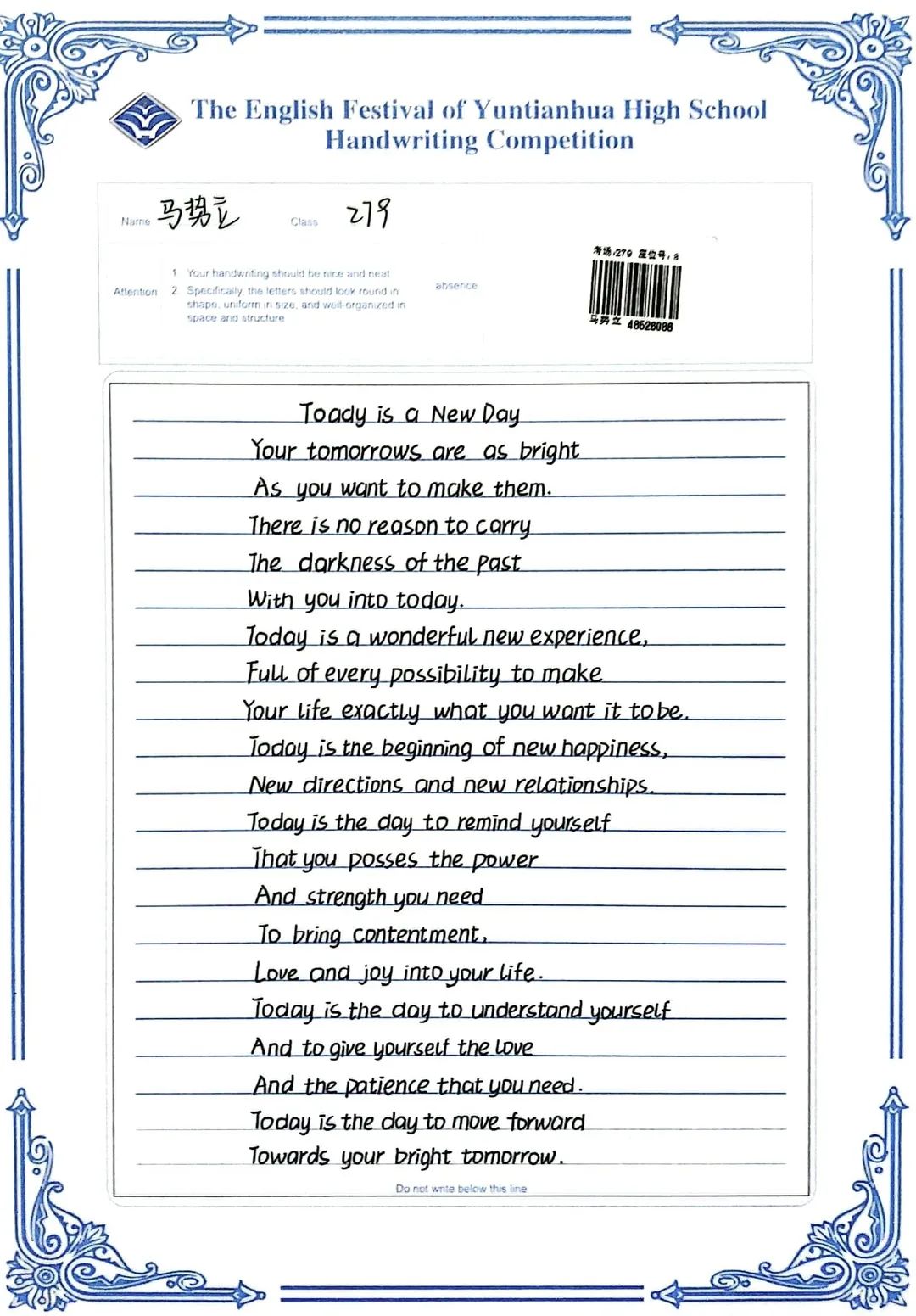 賽中,同學(xué)們都熱情響應(yīng),積極參與,展示了扎實(shí)的英語(yǔ)書寫功底,字跡流暢端正,卷面整潔漂亮,每一幅作品都是獨(dú)一無(wú)二的創(chuàng)作,讓我們一起來(lái)欣賞吧!