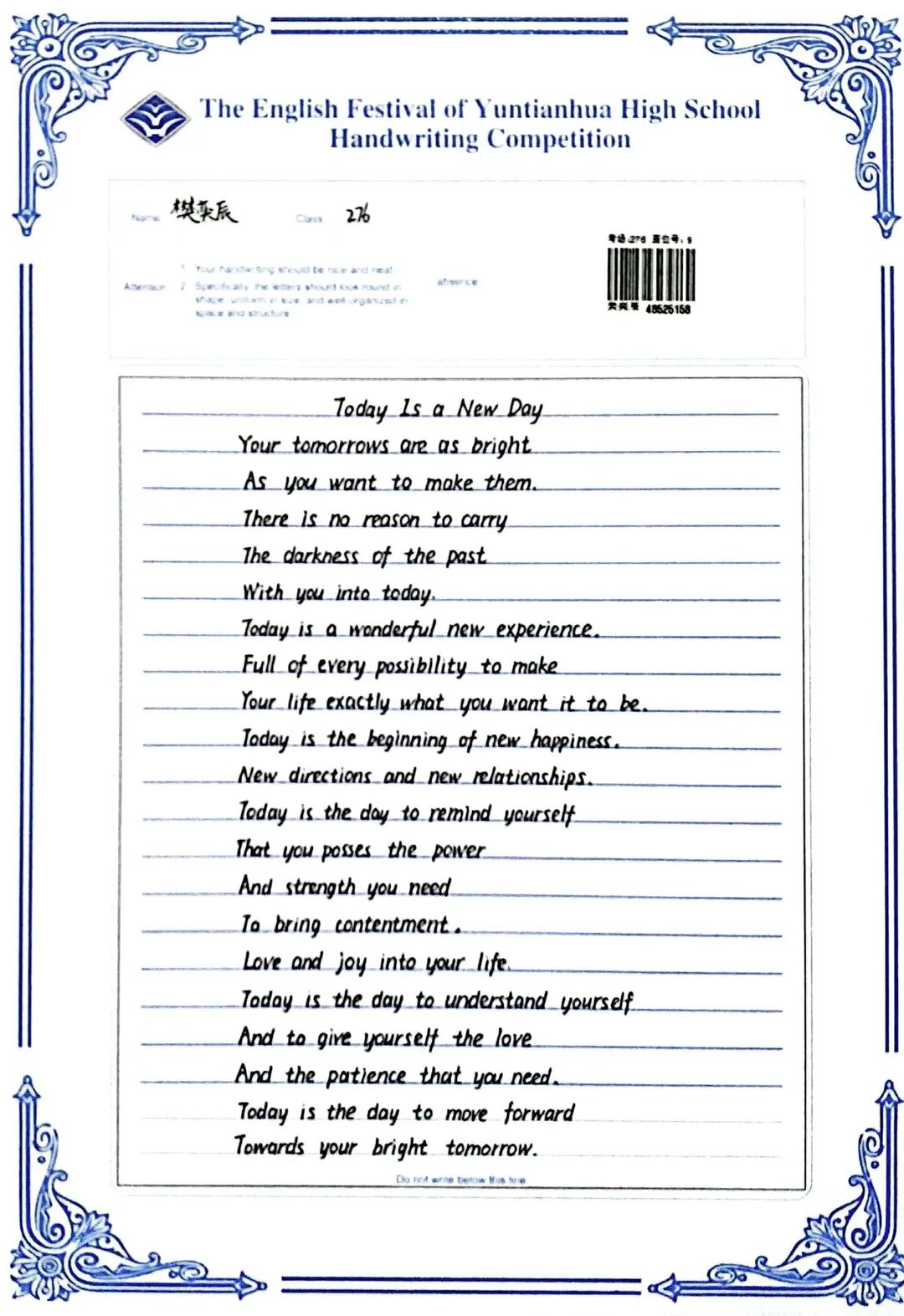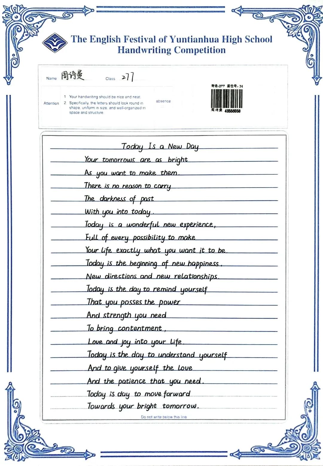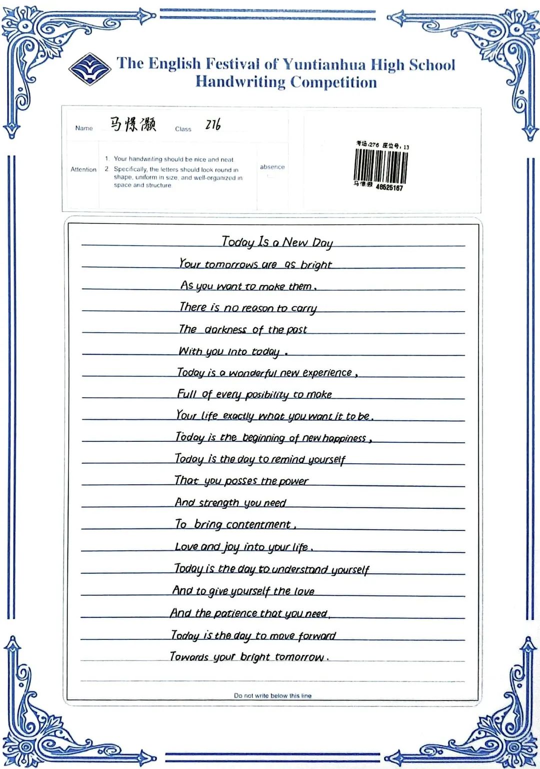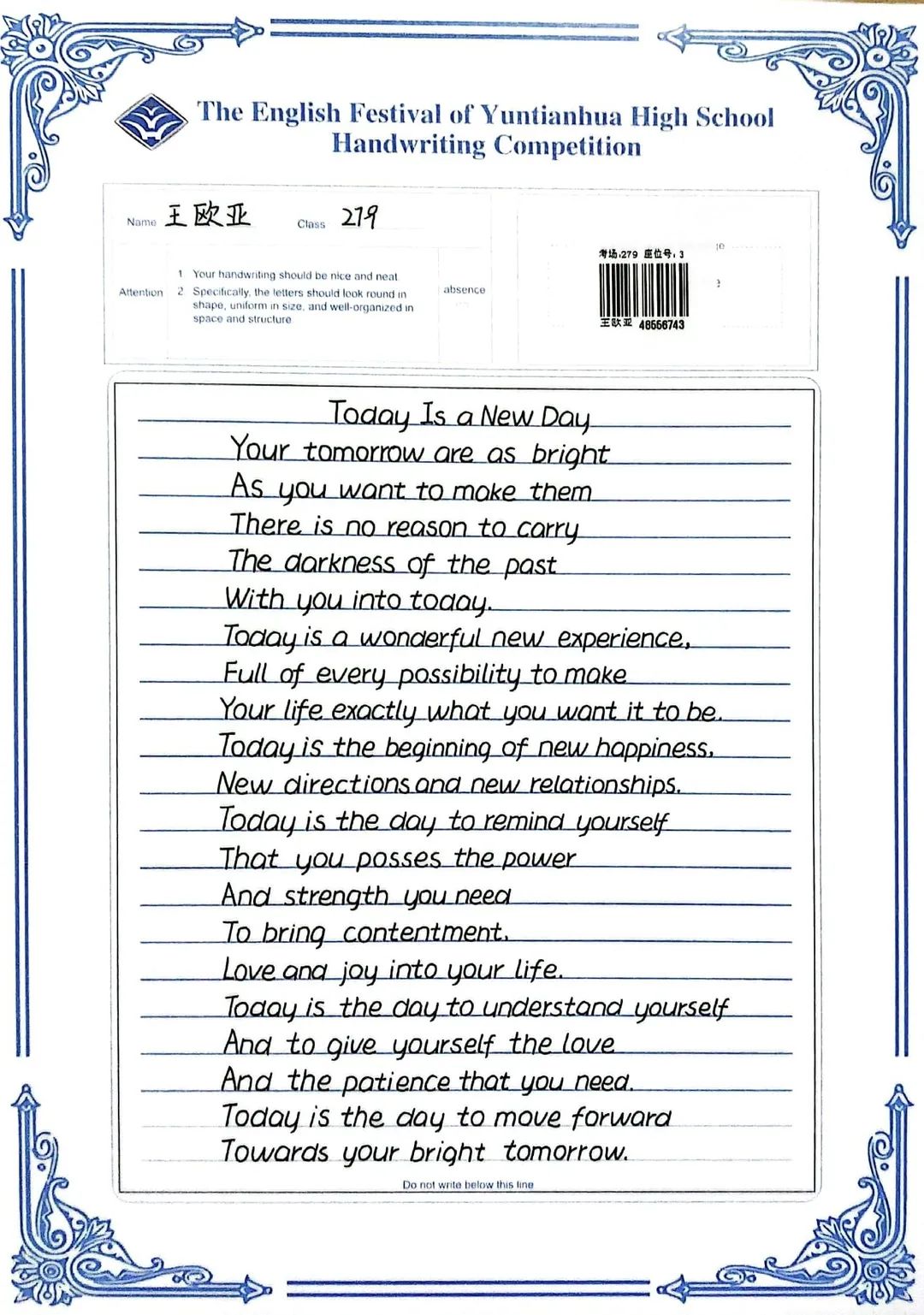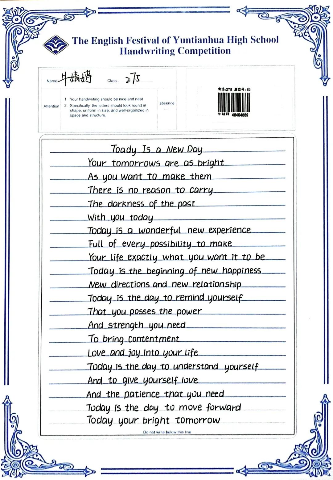 賽中,同學(xué)們都熱情響應(yīng),積極參與,展示了扎實(shí)的英語(yǔ)書寫功底,字跡流暢端正,卷面整潔漂亮,每一幅作品都是獨(dú)一無(wú)二的創(chuàng)作,讓我們一起來(lái)欣賞吧!