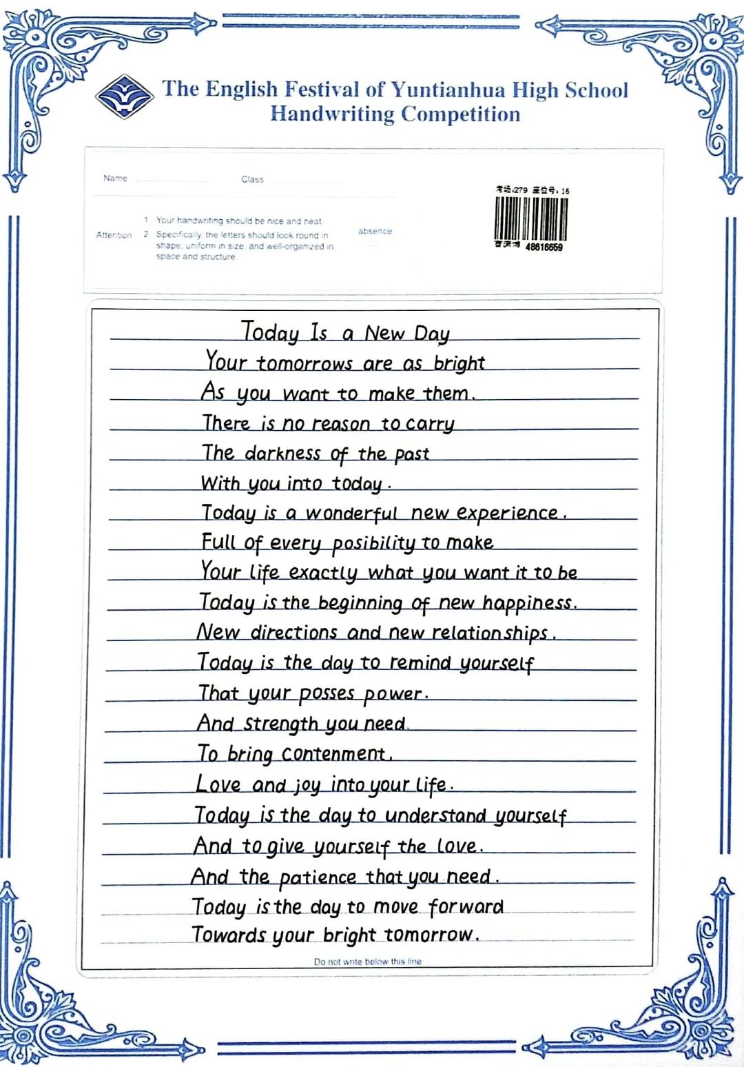 活動(dòng)開(kāi)展前期,高一備課組認(rèn)真討論,研究制定方案。本次比賽,全年級(jí)所有同學(xué)在各班教室同時(shí)進(jìn)行,要求學(xué)生在規(guī)定時(shí)間內(nèi)、在統(tǒng)一下發(fā)的書寫用紙上,正確、規(guī)范地書寫英文語(yǔ)篇。在日常練習(xí)中,老師們認(rèn)真指導(dǎo),對(duì)學(xué)生書寫的糾正從字母的字形、筆順、格位、高度、寬度、傾斜度到字母和單詞間的間距。學(xué)生以極大的熱情和認(rèn)真的態(tài)度積極參與、認(rèn)真練習(xí)。在練習(xí)中,讓學(xué)生感受到規(guī)范是一種習(xí)慣,認(rèn)真是一種態(tài)度。凝心靜氣,聚精會(huì)神,一筆一劃書寫出心中最美的字母。