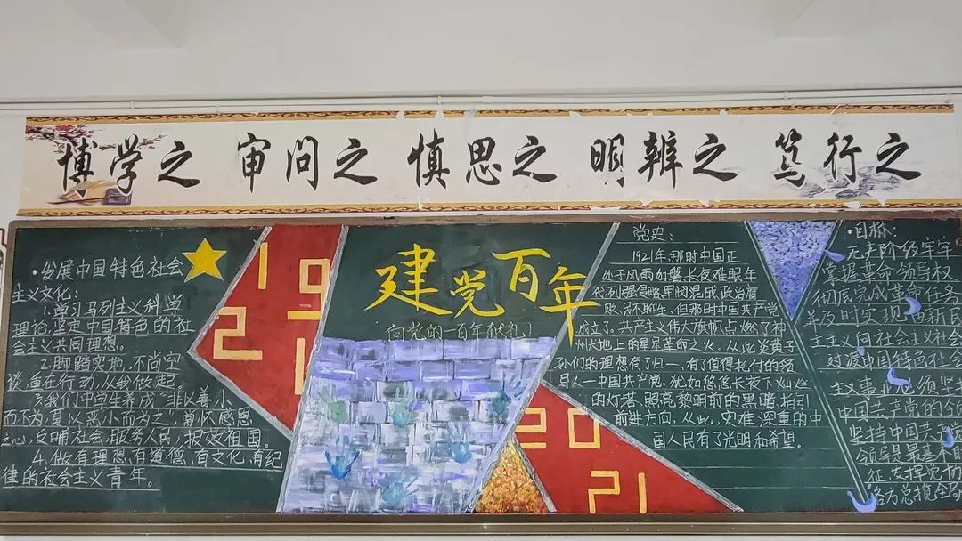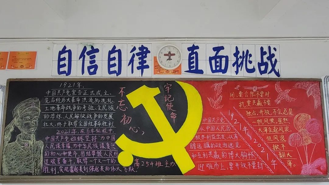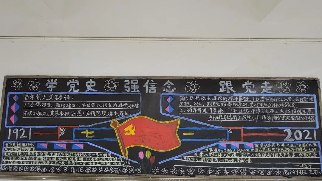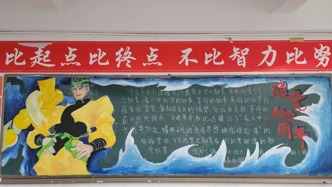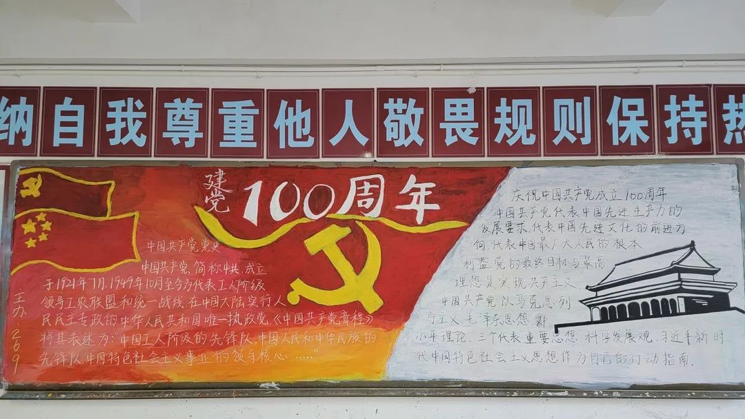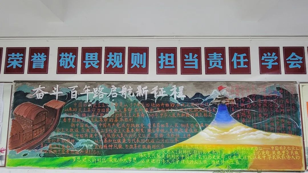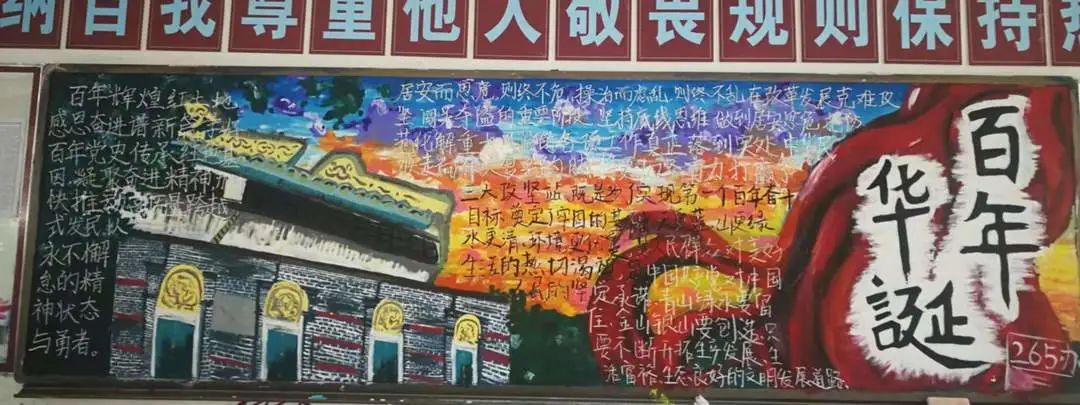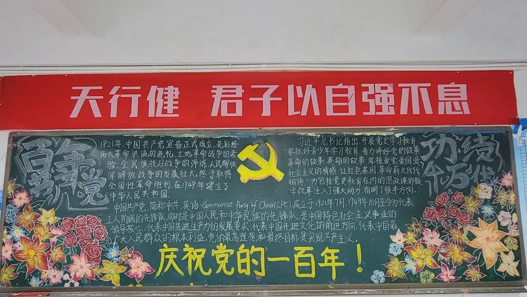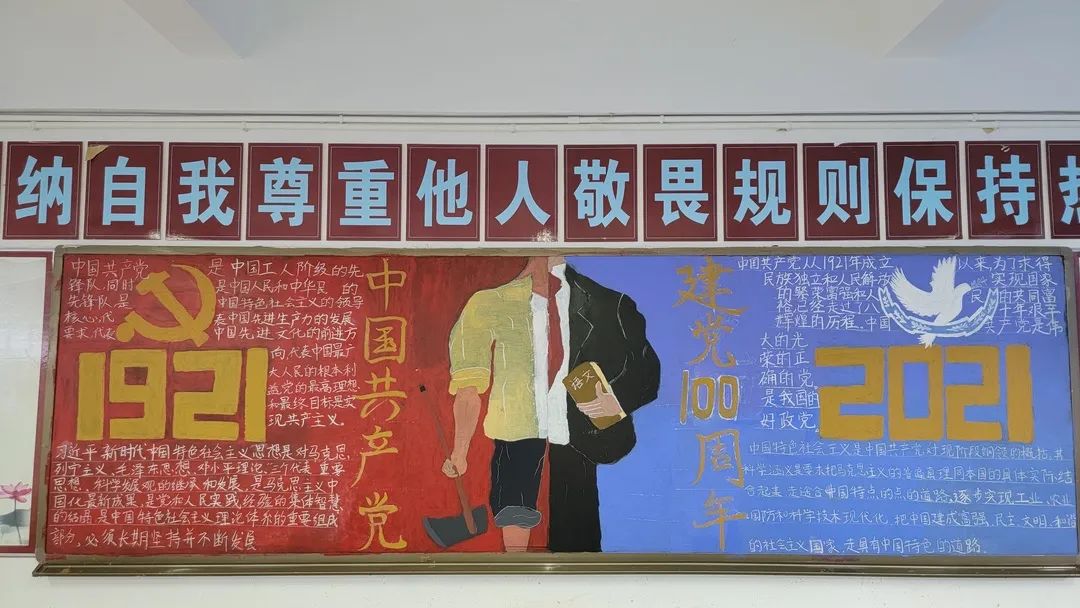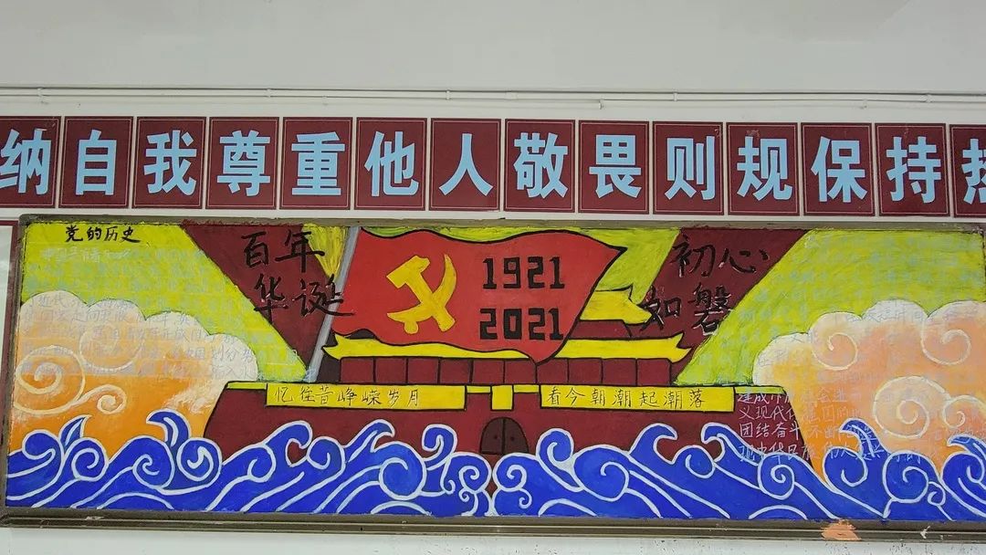 圍繞建黨百年主題,用粉筆描繪風(fēng)云激蕩的百年紅色篇章,書寫下中國共產(chǎn)黨帶領(lǐng)全國各族人民前仆后繼、頑強(qiáng)奮斗,不斷奪取革命、建設(shè)、改革的重大勝利??矗且环诎鍒螅袑h的熱愛之情、有對建黨100周年的“生日祝?!保€有學(xué)生們對祖國未來的美好暢想。