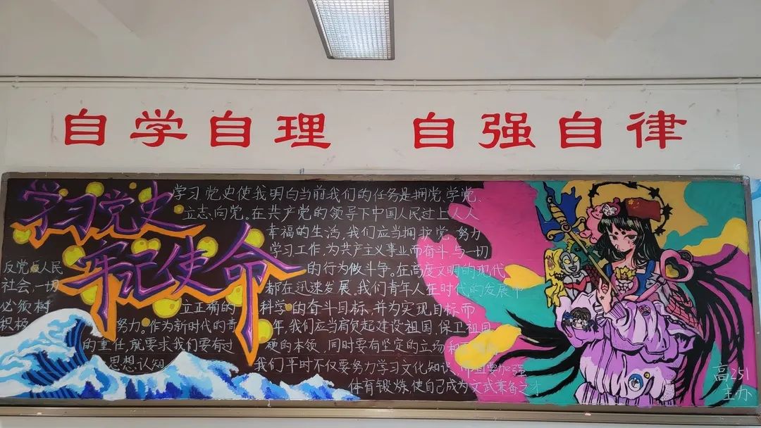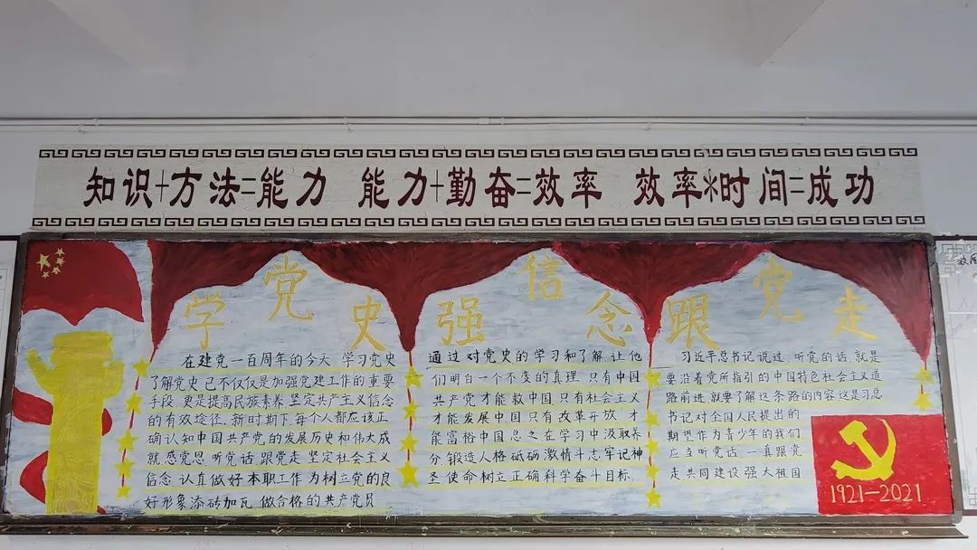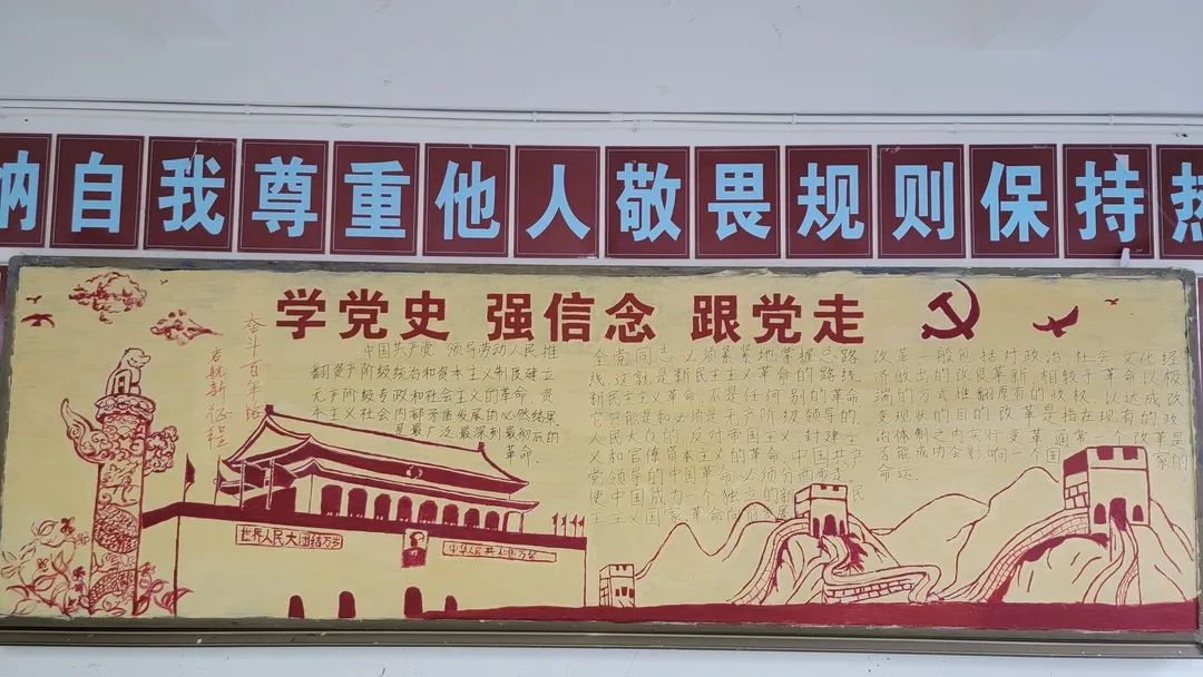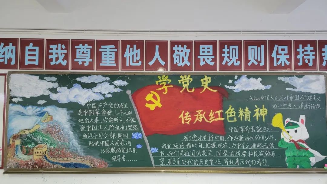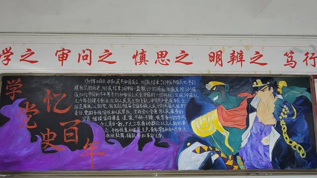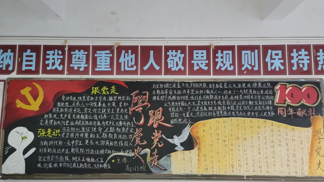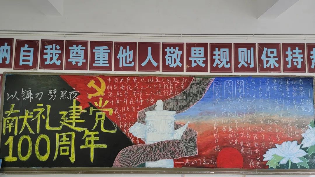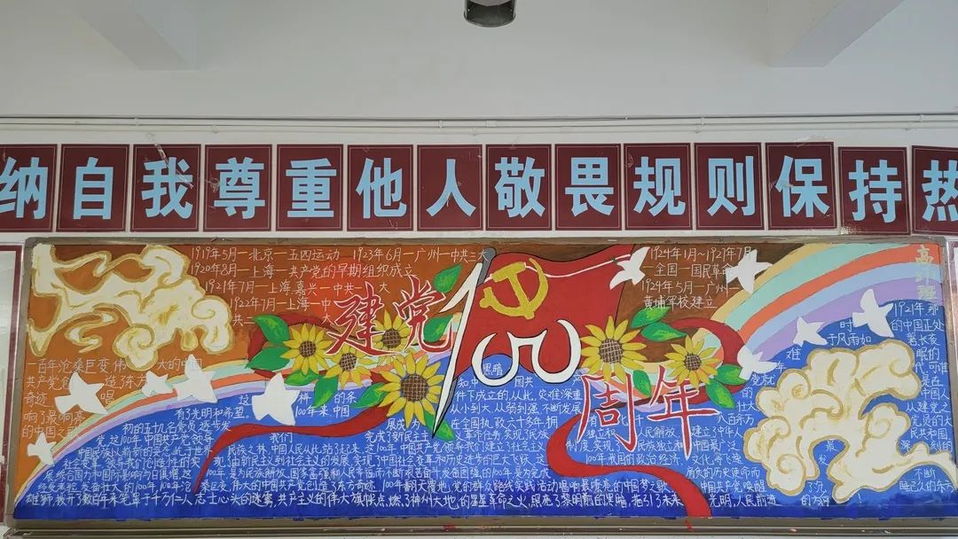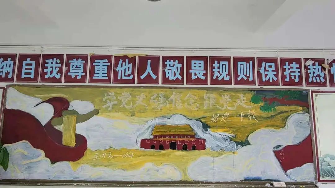 圍繞建黨百年主題,用粉筆描繪風(fēng)云激蕩的百年紅色篇章,書寫下中國共產(chǎn)黨帶領(lǐng)全國各族人民前仆后繼、頑強(qiáng)奮斗,不斷奪取革命、建設(shè)、改革的重大勝利??矗且环诎鍒螅袑h的熱愛之情、有對建黨100周年的“生日祝?!保€有學(xué)生們對祖國未來的美好暢想。