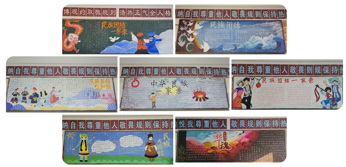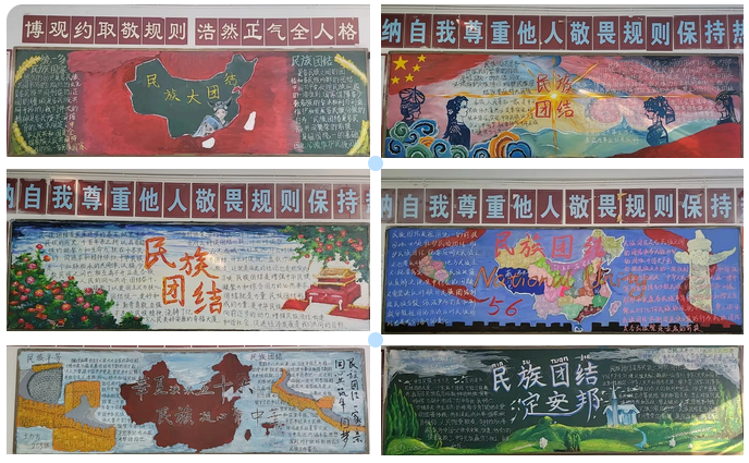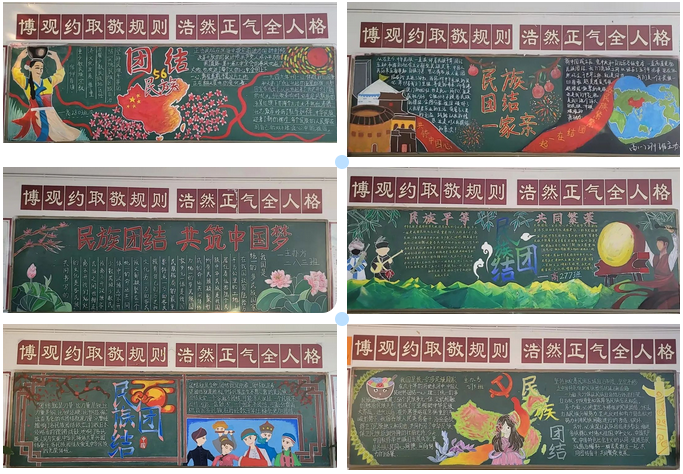 本次以“民族團結(jié)”為主題的黑板報評比過程中,在各班主任的積極引導(dǎo)和帶領(lǐng)下,由各班學(xué)生自己設(shè)計,自己組稿,高一、高二29個班級制作的黑板報,從多個角度展現(xiàn)了我國“中華民族一家親 同心共筑中國夢”的新型民族關(guān)系,盛贊和謳歌了民族大團結(jié)。圖文并茂、內(nèi)容健康向上的黑板報,在各班級的精心組織,內(nèi)容豐富、健康,營造了濃厚的民族團結(jié)親如一家的氛圍,達到了預(yù)想的效果。