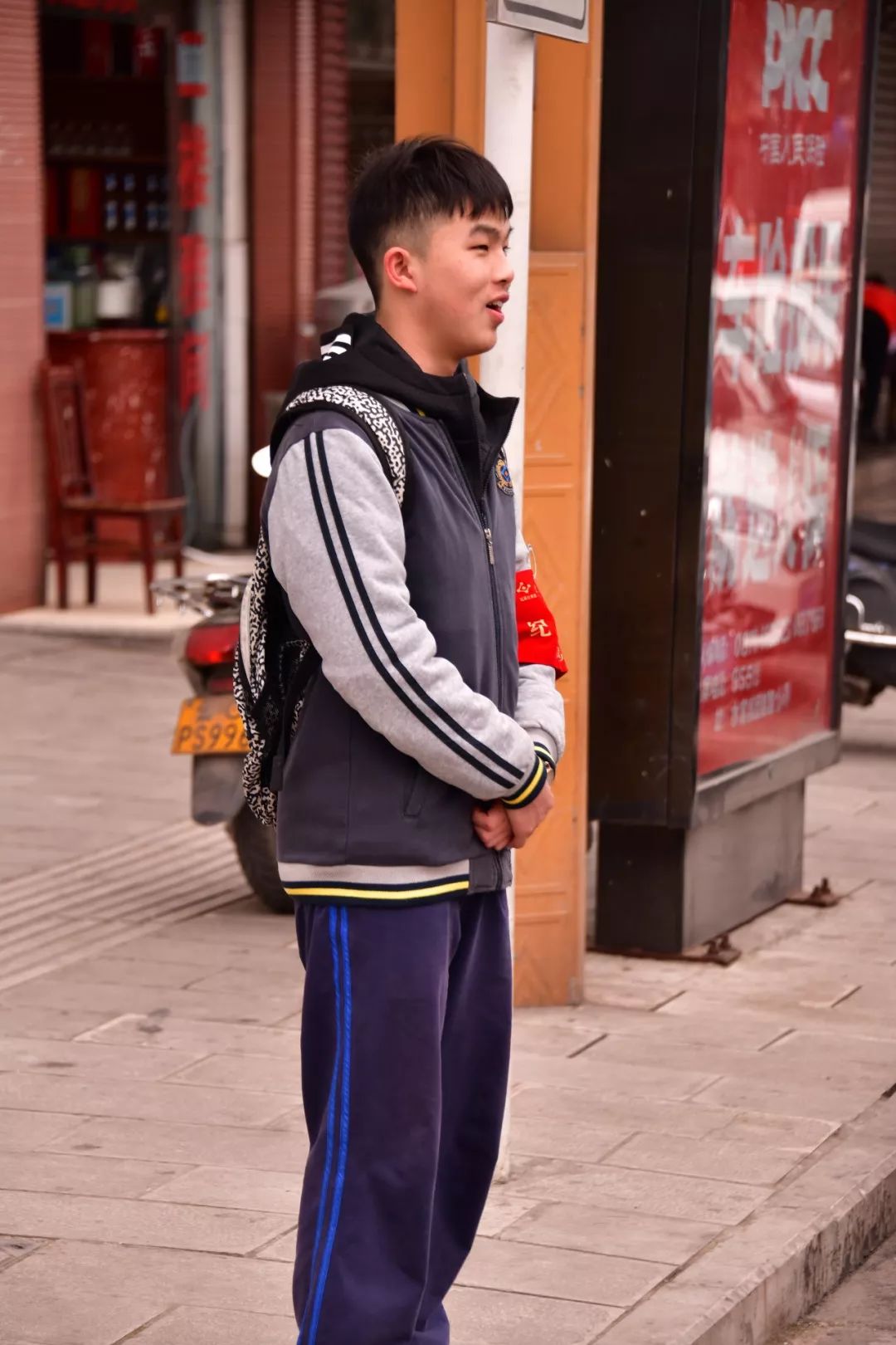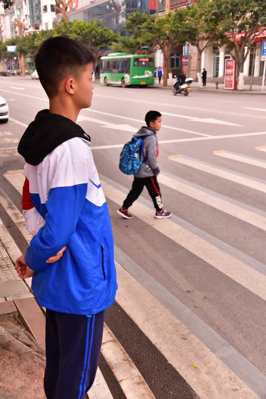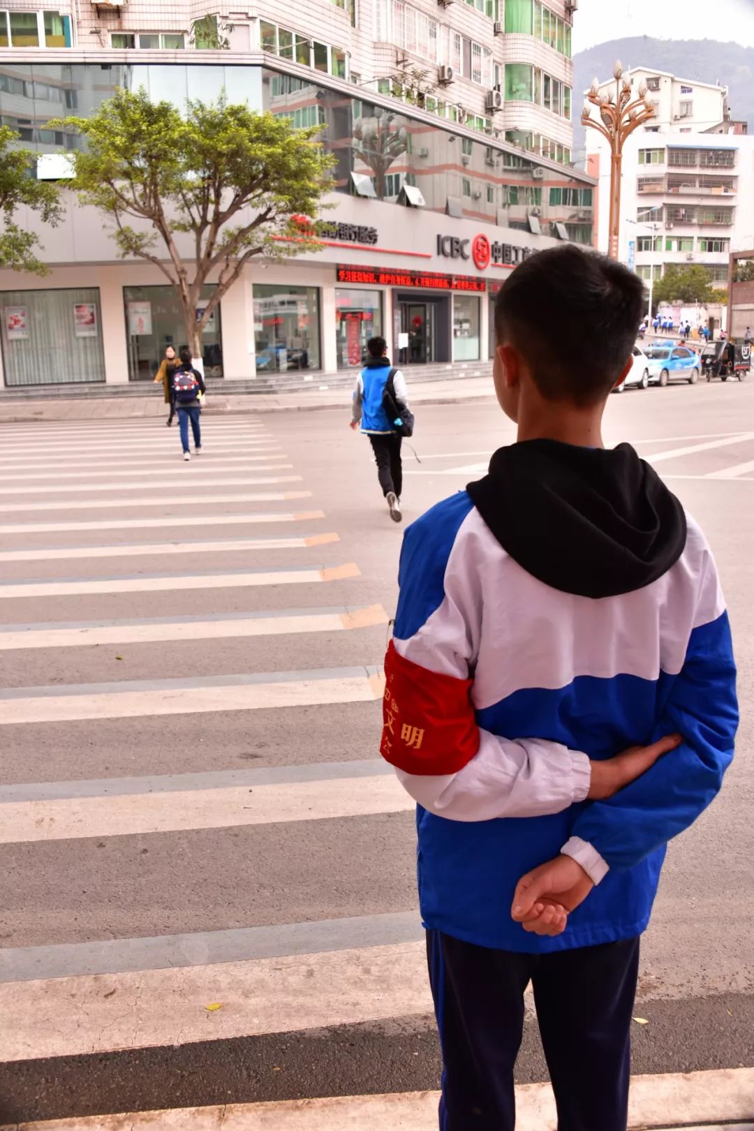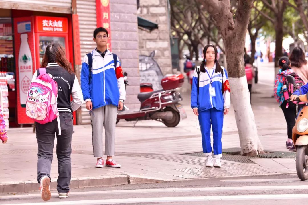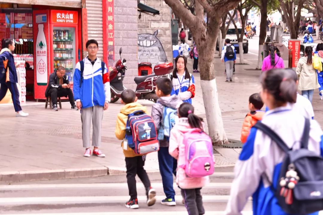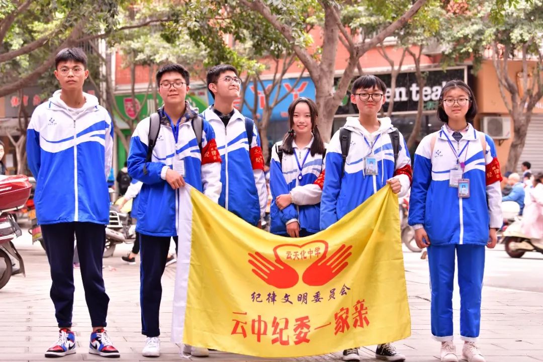 云天化生活區(qū)的一門崗?fù)猓墙煌芗囊粋€(gè)路口。我們看到那里有身著藍(lán)白校服、佩戴“紀(jì)律文明委員會(huì)”袖標(biāo)的云中志愿者們。他們悉心攙扶老奶奶走過斑馬線;禮貌的提醒路人們“阿姨(叔叔),請(qǐng)走斑馬線”;看見一年級(jí)的小朋友他們會(huì)主動(dòng)護(hù)送;遇見不熟悉路的行人他們熱心指路……他們一路護(hù)航,還揮起了紀(jì)律文明委員會(huì)的旗幟,做那恣意中最美的少年。