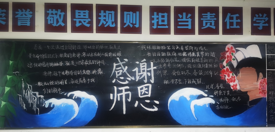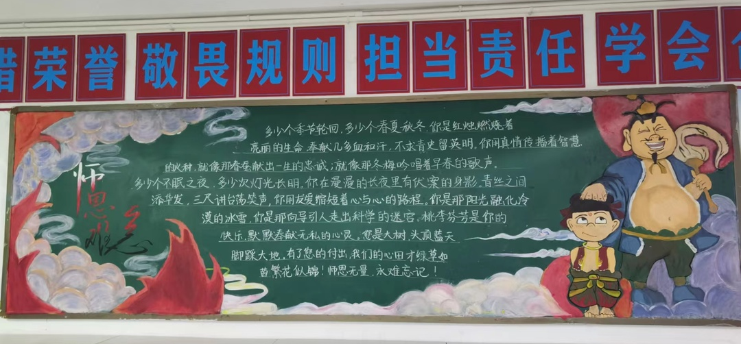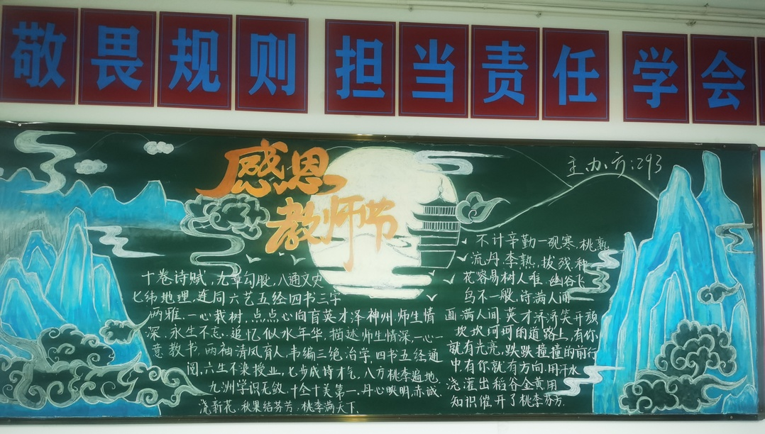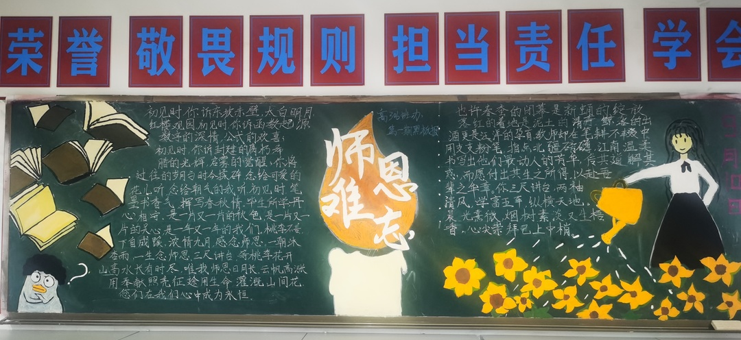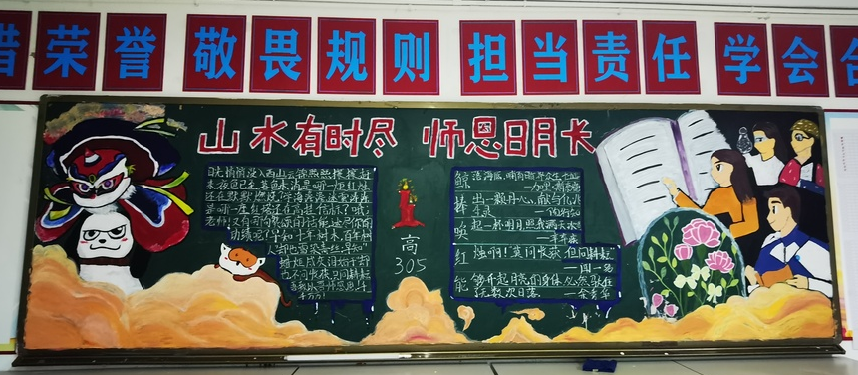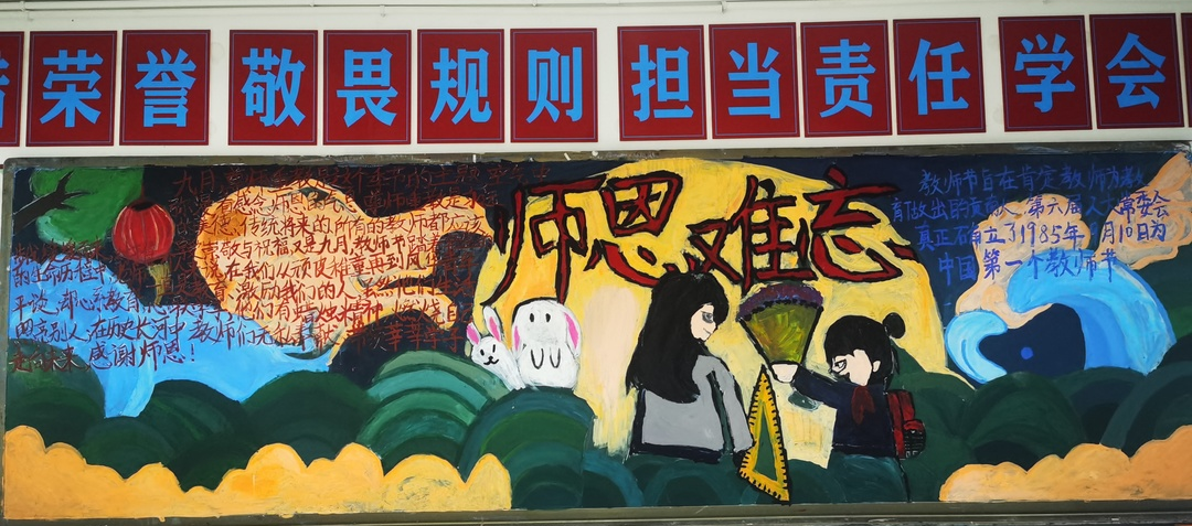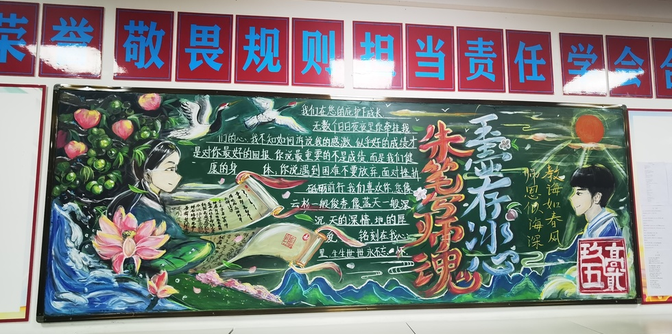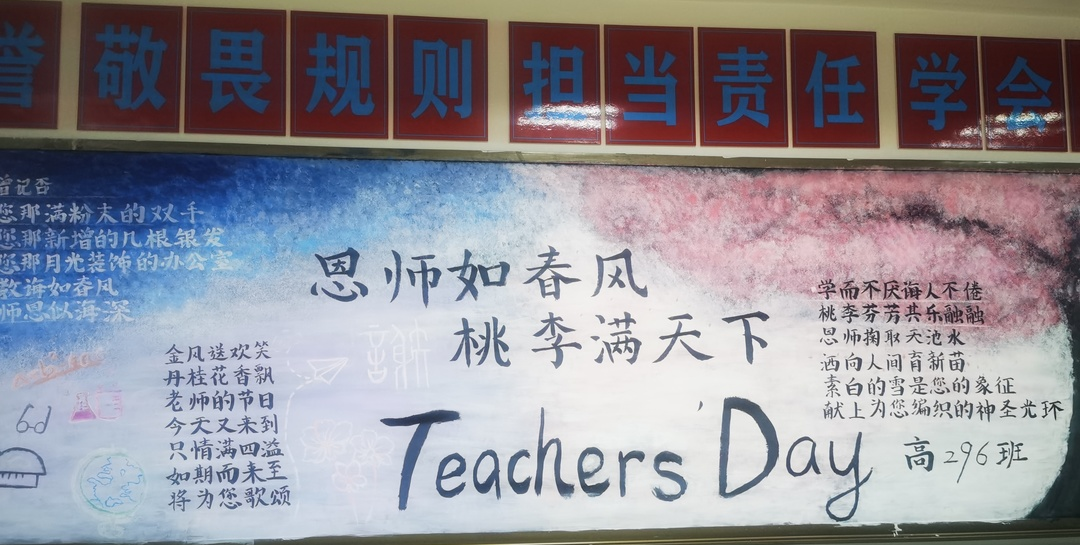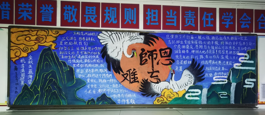 為慶祝第38個(gè)教師節(jié),促進(jìn)師生和諧交流,增進(jìn)師生感情和提高教師自豪感,增強(qiáng)學(xué)生的感恩之心,引領(lǐng)尊師重教的社會(huì)風(fēng)尚,云天化中學(xué)團(tuán)總支組織云天化中學(xué)、云天化實(shí)驗(yàn)高中高一年級(jí)以“難忘師恩”為主題,開展了教師節(jié)專題黑板報(bào)評(píng)比活動(dòng)。