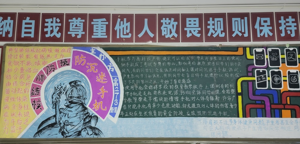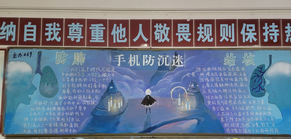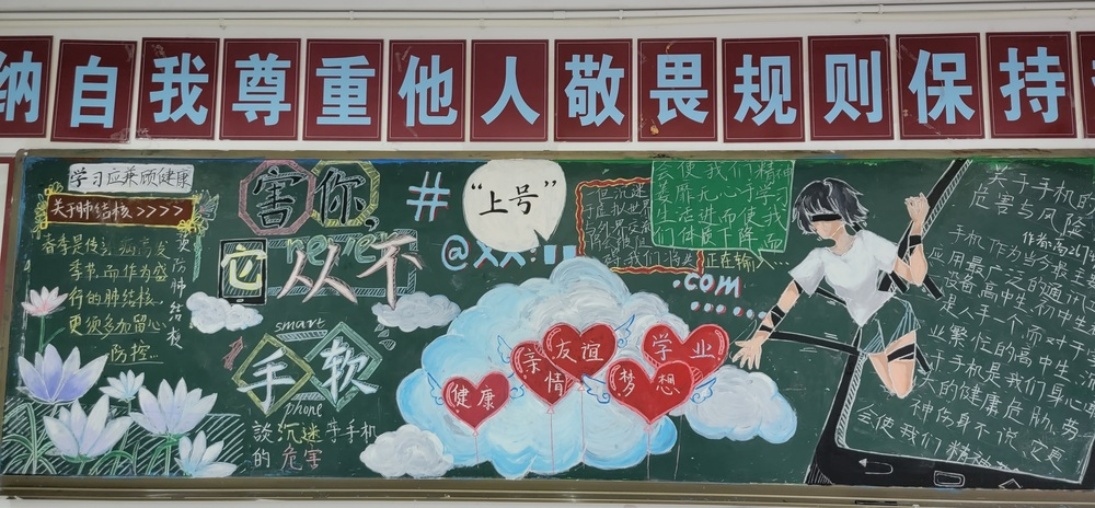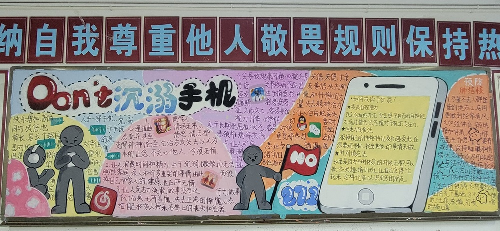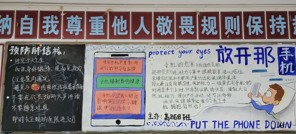 高一年級圍繞“遠離手機,綻放青春”,全方位、多角度宣傳了被手機“綁架”的病態(tài)沉迷,號召同學們端正學習態(tài)度,凈化課堂,營造良好學習氛圍,促進校園學風建設。