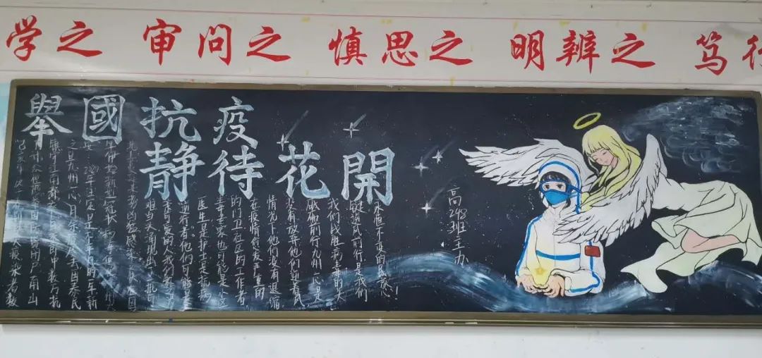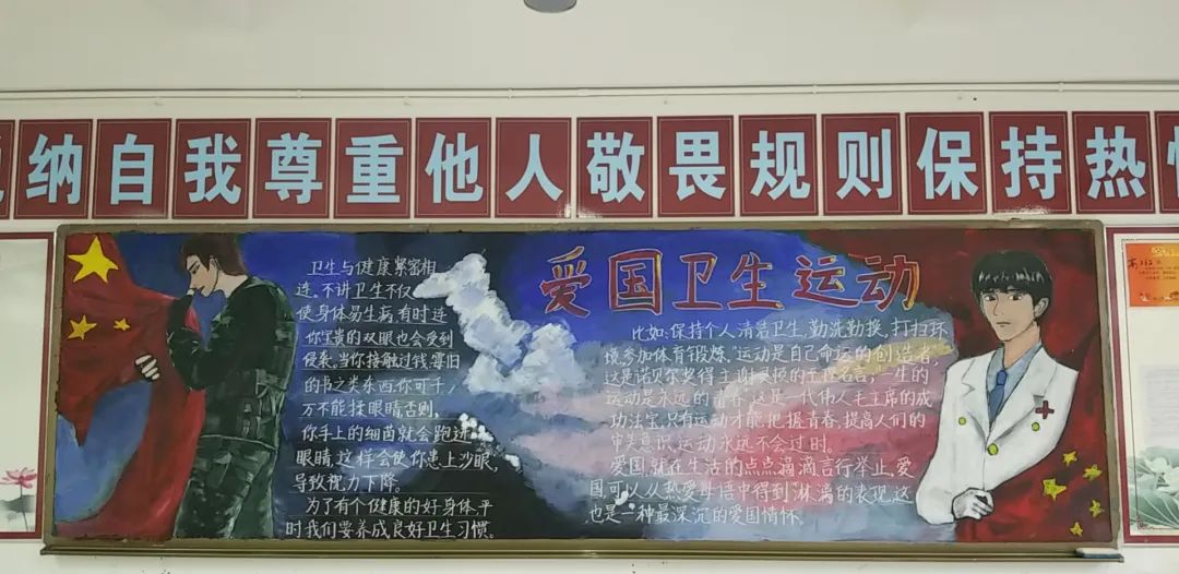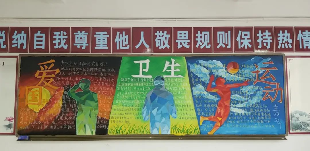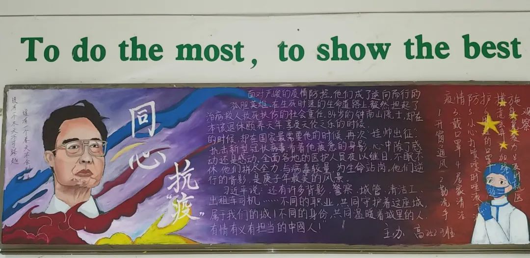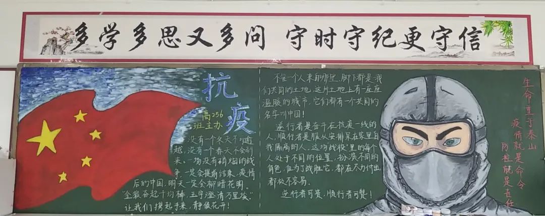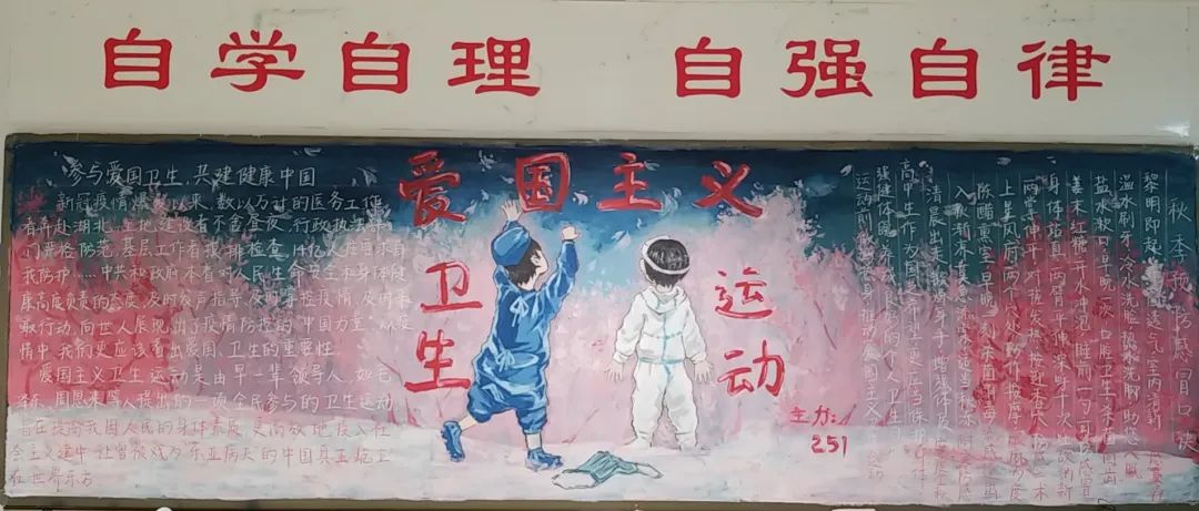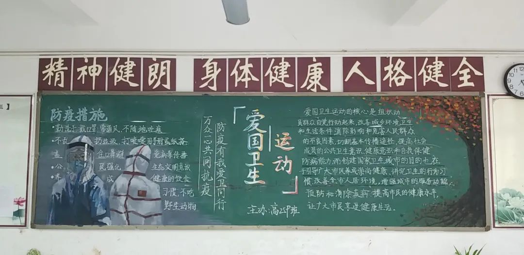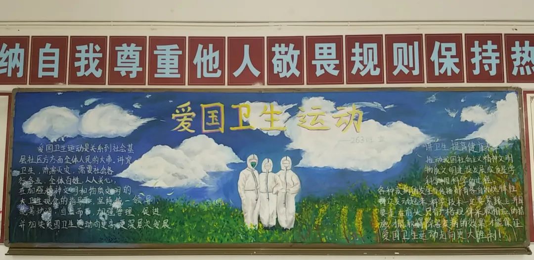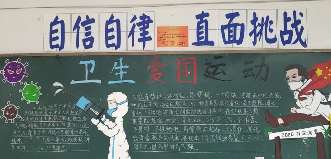 此次比賽得到了各位班主任的大力支持,他們帶領(lǐng)同學(xué)們認(rèn)真對(duì)待,認(rèn)真策劃,收集資料,從自身在疫情期間的切身感受和體會(huì)出發(fā),經(jīng)過(guò)協(xié)商設(shè)計(jì)和課余時(shí)間的努力,按時(shí)完成了板報(bào)的繪制,向勇敢“戰(zhàn)斗疫”的“逆行者”們致敬!防疫抗疫、愛(ài)國(guó)衛(wèi)生運(yùn)動(dòng)的主題躍然墻上。