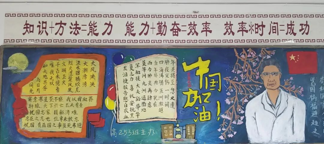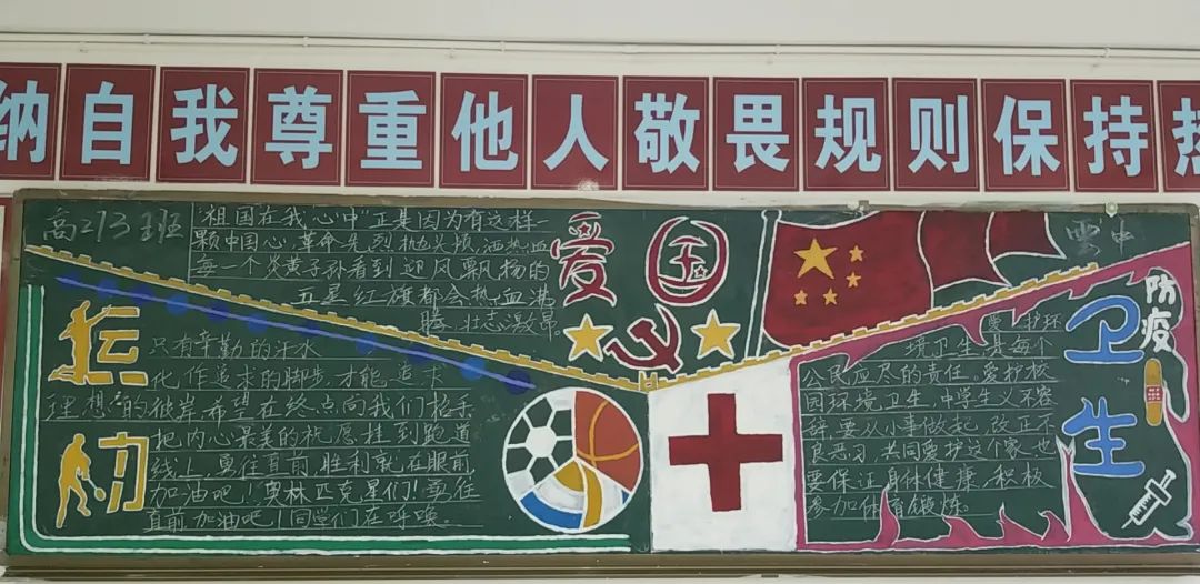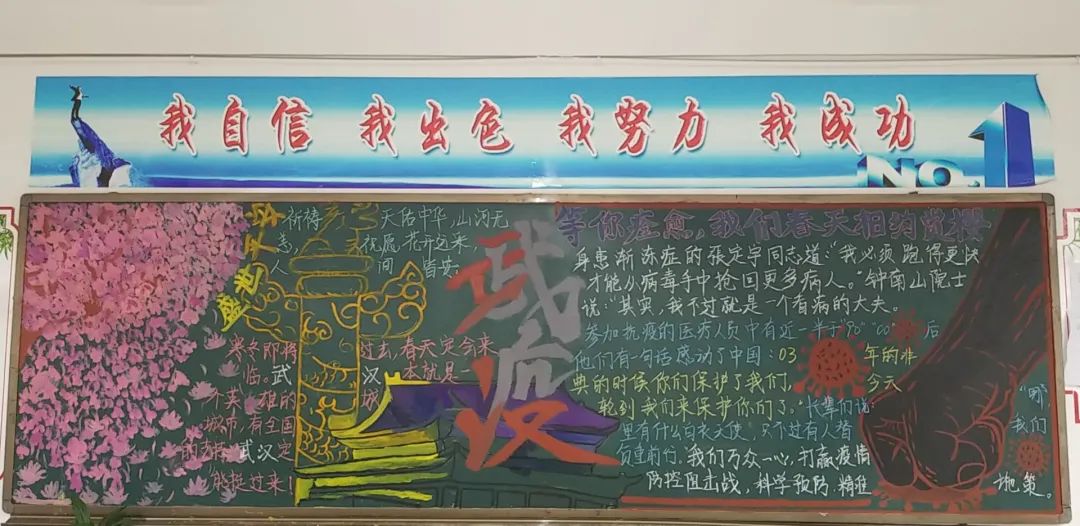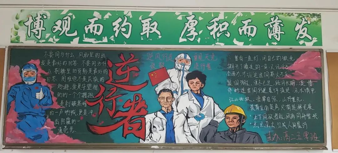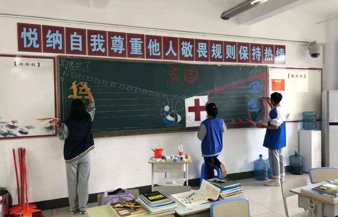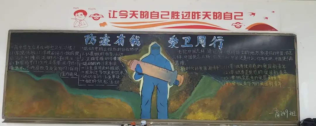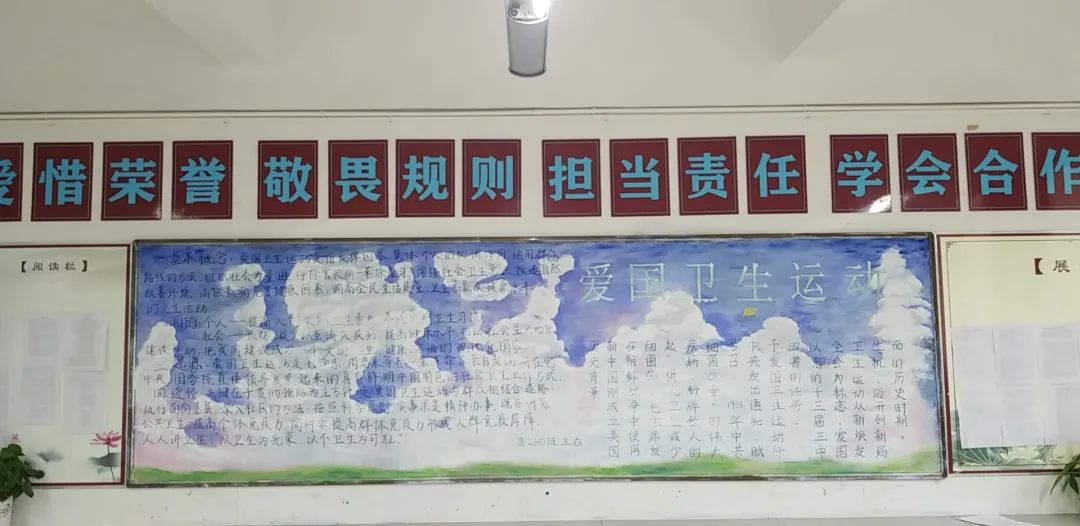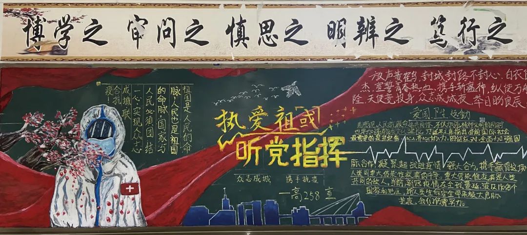 此次比賽得到了各位班主任的大力支持,他們帶領(lǐng)同學(xué)們認(rèn)真對(duì)待,認(rèn)真策劃,收集資料,從自身在疫情期間的切身感受和體會(huì)出發(fā),經(jīng)過(guò)協(xié)商設(shè)計(jì)和課余時(shí)間的努力,按時(shí)完成了板報(bào)的繪制,向勇敢“戰(zhàn)斗疫”的“逆行者”們致敬!防疫抗疫、愛(ài)國(guó)衛(wèi)生運(yùn)動(dòng)的主題躍然墻上。
