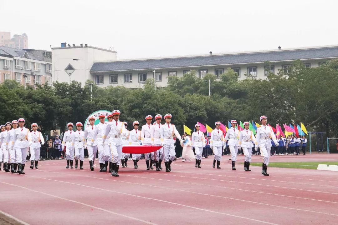 國旗護衛(wèi)隊著潔白正裝,手護國旗,邁著整齊的步伐,喊著嘹亮的口號,莊嚴地走過主席臺,揭開了開幕式的帷幕。他們風華正茂,意氣蓬勃,展現(xiàn)了對國旗的敬畏。