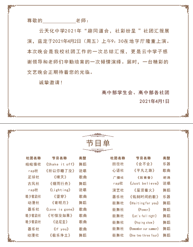 廣播社 《致云中》 指導(dǎo)老師:徐金麗 晚風(fēng)吹過的季節(jié),天空清澈如洗 青春,在云中的春夏秋冬里有了顏色 穿過九思長廊,走過春華秋實(shí) 在端雅尚雅、宇宙玄黃里恣意生長 云中青年不忘初心,溫暖發(fā)聲 除了有視聽盛宴,各社團(tuán)社長,也獻(xiàn)上了他們的年度社團(tuán)匯報(bào)。為了這精彩絕倫的兩個(gè)半小時(shí),學(xué)生會及各社團(tuán)的同學(xué)們辛苦籌備了數(shù)月,從活動策劃、預(yù)算、主題視頻的拍攝剪輯、服裝、表演設(shè)計(jì)到小禮物采購、會場布置、座次安排……均由同學(xué)們按計(jì)劃有序推進(jìn),他們的努力與辛苦付出,鑄就了本次活動的激情與狂歡。 有夢就勇敢去追的孩子是多么可愛 云中社團(tuán)一直是我校全面育人工作的一張靚麗的名片 在云中這方沃土 我們關(guān)注學(xué)生成長,保護(hù)他們對夢想的滿腔熱忱 我們期待,一屆屆云中學(xué)子能在中學(xué)為自己的興趣 播下一枚種子 以星辰開路,以赤焰明志 以熱愛揚(yáng)帆,為夢想篤行 祝福他們,未來能在更大的舞臺去實(shí)現(xiàn)夢想 我們相信 盡管前路荊棘遍布,大道亦會灑滿星光 我們永遠(yuǎn)在追逐理想的道路上 趣同道合,社彩紛呈 我們,明年見!